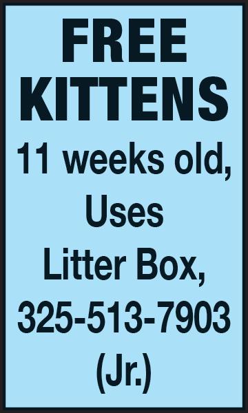 FREE 2 Male dogs, black lab/border collie & St. Bernard. MULTI COLOR KITTENS weaned, litter box trained, to forever home. 325-338-9500.