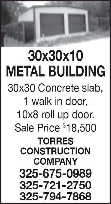 AMAZING GRACE REMODELING. No Job To Small. Specializing In Exterior Painting, Flooring, Carpet, Tile, Wood, Vinyl, Painting, Drywall, Texture, Plumbing etc... Free Estimates!!! Call Charlie 325-660-2655 HAULING TRASH Brush & Junk Cleaning Garages Mowing & Demolition. You Have it, We will haul it. Free Estimates Structural Pipe for Sale 2 2/38 & 2 7/8 325-260-6060 30X50 BARNDOMINIUM $198,000 with 50x10 front porch, 4 Bedrooms, 1 1/2 bath, living room & 3 Windows, Concrete Slab, Plumbing, Electrical, Insulation, Septic Tank, Sheetrock, Paint & many more sizes. 325-675-0989, 325-7212750,