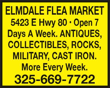 APARTMENTS FOR rent! - starting at $500, Continental Villa Meadow Ridge Estates and Whispering Oaks -1 2 & 3 BR homes various sizes and prices, and Call for availability325-692-5006 32’ X 12’ Tiny Home - Built to Last! Wired & plumbed the right way! Walls on 16” centers and well insulated. Custom built to be lived in and hold up to the wear and tear of life! (3) AVAILABLE! Call more more details! Great Buy & Investment (806) 781-3976 ECONOLODGE INN & Suites New Renovated Rooms, Weekly $43.48 p3 or ($350 including tax) 2 guest. Additional guest $50 per week extra. Microwave and Fridge in room, Free Truck Parking. 840 E Hwy. 80 ABILENE, TX • CALL 325-677-8100 WYLIE ISD Now Hiring Full Time Bus Drivers. Must have CDL with a P and S Endorsement. Custodians Salary DOE Benefits + Insurance. Apply 6249 Buffalo Gap Road, 325-665-7375 (EOE) SONNY JONES Welding. Repair & straighten cracked wheels. Alloy, Aluminum, Magnesium, Steel.Rims $45 or less Mention the ad and get $10 off repairs. 1902 N Treadaway. 325.672.1731. SQUARE DANCE Lessons Beginning Tuesday September 12th 7-8:30 1600 Sherman (St. Johns Episcopal Gym). FB Wagon Wheel Squares Phone 325-665-1480: 325829-3976 or 325-7216013. Fun, Social, and Smart... Stay Active. BOOK NOOK! LOCATED in Frontier Flea Market. 781 Walnut Abilene, Texas. Thousands of Used Books for your reading pleasure. $1.00 and up. Opened Tuesday-Sat 10 - 5 pm HOUSE LEVELERS Needed. Call 325-2086072 CEMETERY PLOTS 2 LOTS Elmwood Cemetery & Memorial Park. 2 lots opened at Garden of Peace. All others are sold out. Call Don Jeffreys 210-849-1746 ESTATE SALES ESTATE SALE Hosted by Good Deal Hunting 1625 Vegas Rd Sat 9-2 & Sun 11:302 Artwork(Country & Farm Themes), Hippo Collection, Floral Red Sofa, Norman Rockwell Plates, Glass Top Rectangular Coffee Table, Green Swivel Armchairs, Howard Miller Mantle Clock, Wooden Bench, Small Roll-top Desk, Rattan/Fabric Armchairs, Vintage Standing Lamps, Small Secretary Desk, Tempus Fugit Grandfather Clock, Dining Table w 8 Rattan/Fabric Chairs, Large China Cabinet, 3 Wooden Barstools, Modern Breakfast Table w 4 Chairs, Fabric Lift Chairs, Reclining Fabric Sofa, Wood/Fabic Wingback Chairs, 5 Tier Wooden Display Shelf, King Size Bed, Vintage Bedroom Suite, Fiesta Pitcher, Noritake Stoneware, Corningware, Pots & Pans, Kitchen Aid Artisan Mixer, GE Refrigerator, Whirlpool Fridge, Washer & Dryer, Frigidaire Digital Freezer, Cookbooks, Linens, Vintage Sewing Machine, Purses, Women’s Clothes(Sz XL), Large Wall Mirror, Vintage Swag Lamps, Office Desk & Supplies, Samsung Flatscreen T.V, Electronics, Vacumns, McGraw Air Compressor, Predator 2000 Generator, Chicago Electric Miter Saw, Hand & Power Tools, Hardware, Ladders, Garden Tools, Planters and Much More! FLEA MARKETS FRONTIER FLEA MARKET 781 Walnut, Abilene. Treasures for all ages Tuesday - Saturday 10am-5pm 325-672-2119