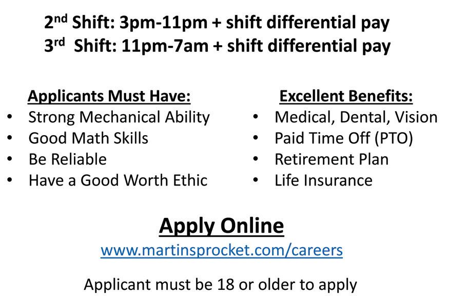 + shift differential pay. 3rd shift 11pm-7am +shift differential pay. Must have Strong Mechanical Ability , Good math skills, Be Reliable and have good work ethic. Great benefits with retirement. Apply Online. www.martinsprocket.com/careers