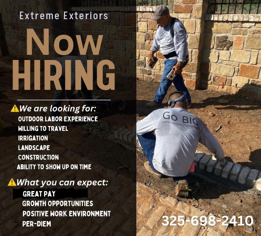 BuffaloWildWings.com / Competitive Pay / Flexible Hours / 401K Available NOW HIRING Journeyman or Tradesman Plumber - Commercial, Residential or New Construction • Pay based on experience. For more info, please call 325-704-4100 LOOKING FOR a job? Find a better life! FaithWorks offers FREE career and skills training for the unemployed & under employed. Next class starts May 30th and Sept 18th Apply today: 1229 N. Mockingbird 325-4372772. www.FaithWorksofAbilene.org APPLY TODAY - A/C Boiler Operator I (Campus Security). Motor Vehicle Technician I, Vehicle Driver II (Food Service). Warehouse Delivery & Receiving Specialist. Abilene State Supported Living Center, 2501 Maple. AbSSLC.org WE’RE HIRING! Double Diamond Signs is seeking a GRAPHIC DESIGNER / Proficiency in Photoshop & Illustrator / a portfolio showcasing your outstanding work. Send your CV & Resume to / doublediamondsigns@ gmail.com JOIN OUR Operating Room Team - TECHNICIAN LVN or RN / Operating Room RN – MITCHELL COUNTY HOSPITAL • EOE – Apply Online Today at www.mitchellcountyhospital.com/careers/ NIGHT WATCHMAN 7 days a week on job site in a Rv. $15 hour. James 830-307-8508