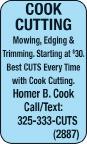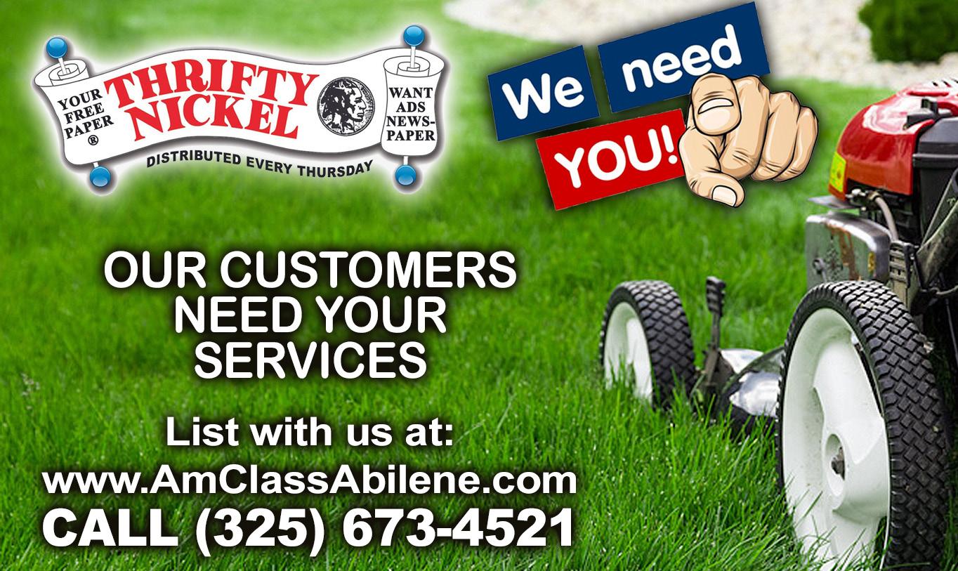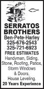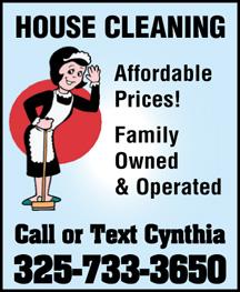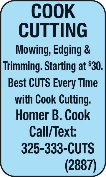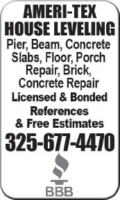 ALVAREZ TREE SERVICE Tree & Bush Removal & Trimming Stump Grinding. Insured / CALL 325-762-4262 LAWN SERVICE Fence Repairs Tree Trimming, Tree Removal. Landscaping, Commercial & Home, Long term Plans available. Call for Estimates Mike 325-668-7755 WILL DO yard work & lot cleaning. Residential or commercial. Reason able rates 325—5135578 contact Eddie. AFFORDABLE MOWING & WEED EATING, Clean up & Hauling. Storage Buildings, Garages & Tree limbs. Free Esti mates. 325-238-1614 HOME IMPROVEMENTS ANDY’S ROOFING. Reasonable Prices, Best Quality in Town! Repairs, Re-Decking, Add-ons, Metal Roof, Windows, Siding Re modeling. Bonded & Insured. Cell 325-6694277, 325-672-1208 GONZALEZ CONSTRUCTION Tile, Ceramic, Concrete, Fencing (New & Repairs) Small Plumbing, Sewer & Drain Problems, Driveways, Sidewalks Patio’s, Welding etc. 325-370-2808 SALOMON ROCHA CONCRETE WORK Driveways, Sidewalks, Storm Cellars,Cinderblock fences. Call 325-236-2543, 325-660-4146 BLUE J Landscape & Tree Service. Trimming, Removal, Stump Grind ing, Planting. Difficult or Hazardous Jobs & Emergency Services. Insured. Free Esti mates. 21 years experi ence. (100 mile radius) Victor Hernandez 325518-8031 STABILITY IS KEY! Are cracks showing up in the Sheetrock and brick work of your home? Do you have sagging floors and doors that don’t shut? Call Key City Foundation Re pair today to sched ule a no obligation assessment. 325261-4211 LIST IT HERE! 325-673-4521 www.AmClassAbilene.com 10429487 "We Have The KEY To Your New Home!" CALL FOR DAILY UPDATES! www.werentabilene.com 325-690-0123 KEY PROPERTY LITTLE ELM CONDO 5402 SOUTH 7TH ST: 1/1-$659/$125 2/1- $749/$125 2/2- $799/$125 WILLOW PARK APTS 2404 NO. WILLIS **ALL BILLS PAID!** 1/1- $759/$99 2/1- $859/$99 1 BDRM/1 BATH: 161 S. Pioneer #54- $649/$649 3 BDRM/1 BATH: 910 N Jefferson $1,049/$800 4626 Clover Ln $1,199/$800 3 BDRM/2 BATH: 1741 Snipe $1,299/$800 2301 River Oaks $1,699/$700 3941 & 3943 Carrera Ln $1,699/$1,000 4 BDRM/3 BATH: 3557 La Jolla $2,300/$1500 10429454 Duplex/ House 1-1 $615 2-1 $675 610 S. Leggett Under New Ownership/ Management FOR RENT No Deposit Military Welcome HUD Renters Call Us at (325) 677-5625 Call Us at (325) 677-5625 10429386 1, 2 & 3 Bedroom Homes Starting at $500 • Stove, Fridge, W/D Connections • Fenced Yards • Pets Welcome *Some restrictions and conditions apply Meadow Ridge Estates Whispering Oaks Continental Villa Call for Availability 325-692-5006 Close DYESSto AFB 10429354 *WE PAY YOUR UTILITIES ON SOME. 325-698-3820 www.cookseyrealtors.com 10429238 1734 EDGEMONT DR House, 2/2/1, Stove, Refrigerator, Central HeatingAir, 2-Car Garage, Fenced Yard, Small Pets OK, 1 Yr $995 MONTHLY 715 EN 14TH ST. Studio Apartment, 1/1/1, Stove, Refrigerator, Window Air-Heat, Water Paid, No Pets, 1 Yr. $325 MONTHLY BLUE J LANDSCAPE & TREE SERVICE Trimming, Hedg es, Removal, Stump Grind ing, Clean-ups, Planting, Flow er beds, River rocks, Borders, Edging, Con crete, Pavers, Flagstone, Side walks, Retain ing Wall, French Drains, Yard lev eling, Dirtwork, Patios, Pergolas, Fences. Free Es timates. Insured. 21 years experi ence. (100 mile radius). Victor Hernandez 325518-8031 ATTENTION DISABLED VETS! I am starting a small Equine Therapy Clinic for the Disabled Veteran. I need help, advice, and a few clients. Also looking for 2 more horses. If you would like to be a part of this, please call Tom at 325-668-5972 10429639