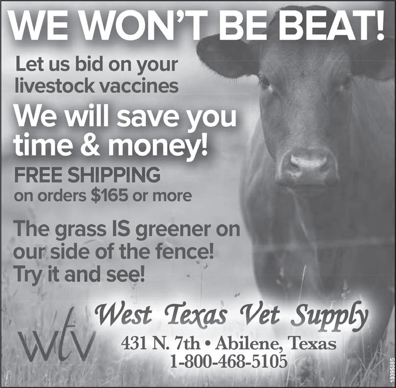 PAGE 10 WE’VE MOVED: 3900 N. 1st, Suite #2 (next to Papa John’s Pizza)OCTOBER 13, 2022 (10/13/22 - 10/19/22) Submit Your Ad By Tuesday 6:00pm AmericAn clASSifiedS (325) 673-4521 WEST TEXAS SPECIAL We Can Place Your Ad in 6 Cities in West Texas. For more info Call Helen at 325-673-4521 AMCLASS ABILENE.COM WWW.THRIFTYNICKELOFABILENE.COM WWW.THRIFTYNICKELOFABILENE.COM WWW.THRIFTYNICKELOFABILENE.COM 325-269-1634 117 Land Grant Lane Baird, TX 79504 Taking Orders for Custom Kill Now Selling Whole Beef & Sides of Beef ($4.99/lb. Hanging Weight) WWW.THRIFTYNICKELOFABILENE.COM WWW.THRIFTYNICKELOFABILENE.COM WWW.THRIFTYNICK ELOFABILENE.COM GET READY for Auc tion #12 Saturday October 15,2022 @ 10 am Kyle, Loutina & Gayle White have moved to Abilene. The first Auction was the thin out to move sale. This is the things that don’t fit in the house, trailer #5 so far. So far we have lots Coke collectibles including signs Lg Coke, oth ers; Elec/other Tools, more Red and White kitchenware and kitchen small applianc es; Vases as; McCoy, Royal Copley/USA more; There is a lot of yard art as Buckets/ water Cans/Bird Houses; I think more Raggey Ann/ Andy, Also Fossil Pics com ing on FB Kincaid Auction & Web. JKincaid TX 6987 Kin ciad Auction 325-676-4077 or 800-445-5282 10-28-2022 Silver & Other Estate Sale in for & Pictures coming. CATTLE ANGUS BULLS AI sired, EPDs, performance and fertility tested, guaranteed. BUNTING ANGUS DeLeon, TX 254-8429866 Cell 254-893-6427 ANGUS PLUS FERTIL ITY TESTED BULLS and CHOICE QUALITY BRED HEIFERS • Calving Now – Al len Brangus Ranch 325-4835554 • After 6 PM CHAROLAIS BULL STOP Quality Breed ing-Age Bulls Fertil ity Tested – Terry Norman 325-597-0796 • 325-456-8582Brady, Texas CHOICE QUALITY Brangus & Angus Plus Bulls & Heifers – 20 Choice quality two year old Brangus & Angus Plus bulls - the six older bulls are fertility tested and ready to work. –36 fancy yearling past heifers, ready for the bulls. ALLEN BRANGUS RANCH (325) 483-5554 after 6:00pm BELTED GALLO WAY Cow Calf Pair ($1,475). Cow is 5 years old. She has had two calves. Bull calf was born 7/2/22. 3 months old. His daddy was a Belted Galloway with a full belt. (325) 668-7447 • CASH ONLY.