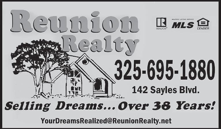 Hallmark Real Estate services. 325698-4440. AMERICA’S #1 Safe. Protect your family, valuables and firearms Available. HPS LIB ERTY GUN SAFES 6545 S. US Hwy 377, Stephenville,Tx. 254967-9985 or 254-9774443 www.libertysafe. com Jumps & Tents for Events (325)899-5550 www.jumpsandtents.com We Rent Waterslides! NOW $14,800 Aprox 80% off . Camp Log Cabin Set, Pre cut log walls, Main Timber Rafter Ridge Beams,all plans, Can Haul. Pay only on delivery.Get Detailed information @ 214-771-6887 CUSTOM JEWELRY! Use your old, heirlooms and make them new again! call 325-513-2743. Big Country Gold. 4541 Catclaw Drive. 2TON Presented by At tHe ABILENE TEACHERS FEDERAL CREDIT UNION .orgGet Your Tickets at 10429330 ATTENTION DISABLED VETS! I am starting a small Equine Therapy Clinic for the Disabled Veteran. I need help, advice, and a few clients. Also looking for 2 more horses. If you would like to be a part of this, please call Tom at 325-668-5972 10429639 10429676
