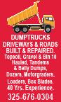 DUMPTRUCKS DRIVEWAYS & ROADS BUILT & RE PAIRED. Topsoil, Gravel & Bin 10 Hauled, Tan dems & Belly Dumps, Dozers, Motorgraders, Loaders, Box Blades. 40 years experience. 325-676-0304