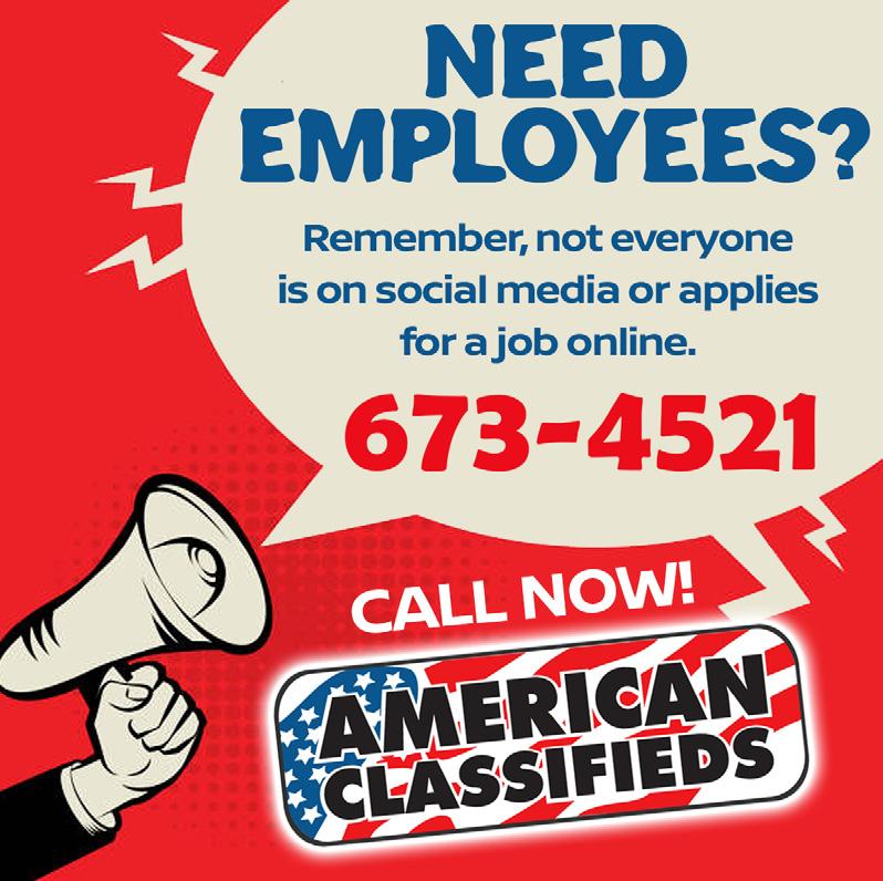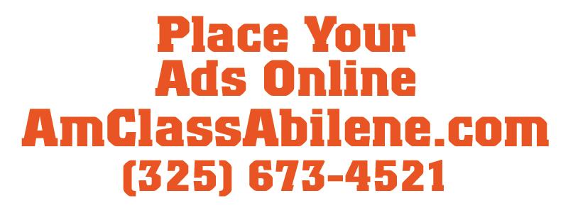 VIEW ONLINE • PLACE YOUR AD ONLINE • www.AmClassAbilene.com Monday 8:30am - 4:30pm Tuesday 8:30am - 6:00pm Wednesday 8:30am - 4:30pm Thursday 8:30am - 4:30pm Friday CLOSED VOLUME 42 • ISSUE 38 • OCTOBER 13, 2022 (10/13/22 - 10/18/22) 3900 North 1st, Suite 2 (325) 673-4521 HABLAMOS ESPANOL 10429361 New Renovated Room: Weekly $43.48 pn ( $350 including tax) 2 guests additional guest $50 per week extra. Weekly Full Payment in Advance *Subject to Availability FREE High Speed WiFi • FREE Microwave in Room • Pet Friendly (Pet Fee Applicable) • FREE Fridge in Room FREE Truck Parking 840 East Hwy 80 • ABILENE 79601 CALL 325-677-8100 COMPLIMENTARY BREAKFAST! $43.48 EconoLodge Inn & Suites American Classifieds / Thrifty Nickel © (325) 673-4521 Call us to place your next ad. Remember, not everyone is on social media. Print Still Works! Open 7 Days a Week 601 Scott St Tye, TX 325-690-9028 Check out www.RedmenBingoTexas.com & our Facebook Page Bingo Sessions at 7pm and 8:30pm RedmenBingo 10429660HPS 6545 S. US HWY 377 • Stephenville, TX 254-967-9985 WE CARRY SAFES & ACCESSORIES. HUNTING FOR THE BEST SAFE? Delivery & Installation Available Made in America! Lifetime Warranty! SAFE 10429189 Come Stay With Us! Monthly $750 and Weekly $280 + Tax ROOM AMENITIES: FREE WIFI Microwave Refrigerator Cable TV Guest Laundry Facility Ground Floor Pet Friendly Trucking Surrounded by all kinds of Restaurants, Grocery & Liquor Stores and Hospital. 3210 I-20 & Pine St. • Abilene, Tx 79601 CALL: 325 677 2687 Always Deliver more than Expected Frontier Inn 10429305 10429421 Come work for the Abilene State Supported Living Center! “Work where your work makes a difference” Visit us at AbSSLC.org or text “Careers” to 325-255-4442 Start your State of Texas CAREER! AbSSLC is an Equal Opportunity Employer & Provider Abilene State Supported Living Center 2501 Maple • Abilene, TX 79602 Direct Care Professional Now Hiring These Positions: • Rehab Therapy Tech II • Food Service Worker • LVN TRI-CARE IS DRASTI CALLY removing smaller Pharmacies from their Net work by Oct. 24th, 2022. They will be cut out except for big Pharmacies. Call for change. Senator Cody Er ickson 325-675-9779. Sen ator John Coryn 202-2242934, Seantor Ted Cruz 202-224-5922, Senator Al Green 202-225-7508. IPHONE 11 PRO MAX, 64 GIG, black, w/ cover & screen protector. $400.530-355-4055 Local GERMAN SHEPHERD Puppies. Very nice quality. Registered, shots, guaran teed, references. 325-6698210 PRECIOUS MOMENTS COLLECTION 900 pieces 1993-94 through 1999. Includes Anniversary Comemo rative, Membership, Easter Seal, Birthday Club, Sam’s Sets & oth ers. Call for list to 830496-3024 VACANT LOTS 2669 Chi na street 75x120 $49,000 for all 3 vacant lots. Abilene. Hallmark Real Estate servic es. 325-698-4440. FIREWOOD- DRY Oak and Mesquite. $195 cord loaded on your truck. Dealers Wel come. Opened everyday. 8 am-5:30. Reed Farm store. 3935 FM 18 Baird, Texas 79504 325-660-8440
