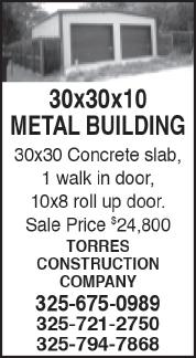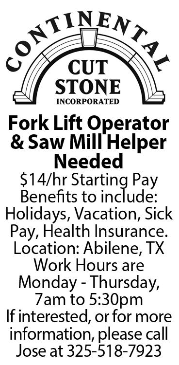 Civil- Pay DOE + Benefits paid 100% included Apply www. taylor countytexas. org/jobs.aspx or 325-674-1220 Apply in person. 400 Oak Street Suite 120, Abilene. 8-12 and 1-5.EOE NOW HIRING Class A CDL Flatbed Drivers for Local and OTR . Great Pay and Benefits. Please call JW 325-864-9027 SHOP SMITH Mark IV w/ router. Jigsaw, 12” Planer, dust collector, lathe tools, book covers $2500 firm. 325-6987539. NOW HIRING FullTime Custodial Position with benefits!! working evenings & weekends required. For details to apply, call Pioneer Drive Baptist Church • 701 South Pioneer, Abilene, Texas 325-692-6776. TORRES CONSTRUCTION 325-675-0989 325-721-2750 325-794-7868 30x40x10 Barndominium - 3 Bedrooms, 1 Living Area $170,000 30x30 Barndominium - 2 Bedrooms, 1 bath, Kitchen $110,000 40x40 Barndominium - 1500 SqFt $190,000 All with Concrete Slab, Plumbing, Electrical, Insulation, Septic Tank, Sheetrock & Paint 30x50 Barndominium w/ 50 x10 Front Porch, 4 Bedroom, 1 1/2 bath, Living Room & 3 Windows. $240,000 10429429 REPAIR • RESTORE RESTYLE Turn Ordinary INTO EXTRAORDINARY 4541 Catclaw Dr 325-513-2743 goldbuyerabilene.com Big Country Gold & Custom Jewelry We buy gold, silver, platinum, diamonds, & precious stones Turn your scrap into CASH! 10429218 Turn Your Scrap into CASH! Fencing Tree Service Landscaping Firewood 325-668-9213 Mike Rogers, Owner 10429462 THE MALL OF ABILENE 325-695-3700 3532 NORTH 6TH STREET 325-704-3130 POKEMAN • SPORTS CARDS COMICS • TOYS 10429369 BUY • SELL • TRADE GARAGE SALE GUIDE Thurs, Fri, & Sat. Oct. 13, 14, & 15 __3160 So. 2nd.......................S.................... Fri. & Sat. Oct. 14 & 15 __5417 Willow Ridge...............S......8-4, 8-12 __3101 Ivanhoe......................S.............8-12 __3442 S. Willis......................S..............8-6 __4426 Pamela Dr...................S..............8-2 __1025 Alameda......................S........8-5, 8-4 __4002 Concord......................N...............8-2 __821 Ave J.........................(Anson).........8-? Fri. Sat. & Sun. Oct. 14, 15, & 16 __1917 Sycamore...................S.............7-12 Saturday, October 15 __Heritage Parks Subdivision Community Sale Hwy 351/Liberty Blvd..............N...............8-3 Winterhawk Dr. Multiple Sales ...S.................... __4525 Rio Mesa Dr................S...............9-3 __3 Queen Anne’s Lace...........S...............8-2 __4202 Sherwood Dr..............S...............8-? __2318 Glenwood....................S...............8-4 __2225 Minter Lane.................N...............7-4 Sat. & Sun. Oct. 15 & 16 __4588 South FM 707.............S...............8-? ESTATE SALE GUIDE Saturday & Sunday Oct. 15 &16 3241 High Meadows ....S..... 8:30-3:30, 12-3 AUCTION GUIDE Saturday, October 15 1905 Cottonwood............ (Abilene).........10am 2200 Butternut............. (Abilene).........10am Sunday, October 16 #4 Silo View (East of Ft Phantom)...... (Abilene)...........1pm 10429374SONNY JONES WELDING 1902 N Treadaway • 325-672-1731 Mention Ad& get $10.00 OffRepairs • Alloy • Aluminum • Magnesium • Steel Repair & Straighten Cracked Wheels Blue J Landscape & Tree Service Trimming, Removal, Stump Grinding, Hazardous Jobs & Emergency Services. New & Old Landscapes with a Modern Touch. Total Yard Clean-Ups. 100 mile radius. Insured & Abilene Chamber Member Victor Hernandez 325-518-8031 FREE Estimates 21 Yrs. Experience 10429678