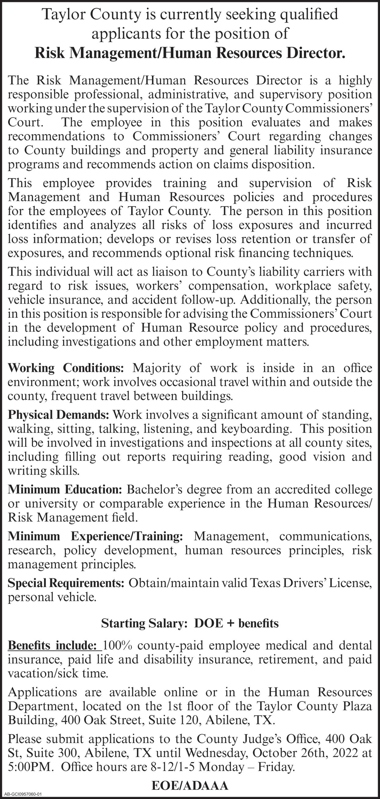 Operator PCT # 2 $35,000 Annually plus benefits. Apply www. taylor countytexas.org/ jobs.aspx or 325-6741220 Apply in person. 400 Oak Street Suite 120, Abilene. 8-12 and 1-5.EOE L SHAPE Fuel Tanks, good condition $300 each. 325-338-0185
