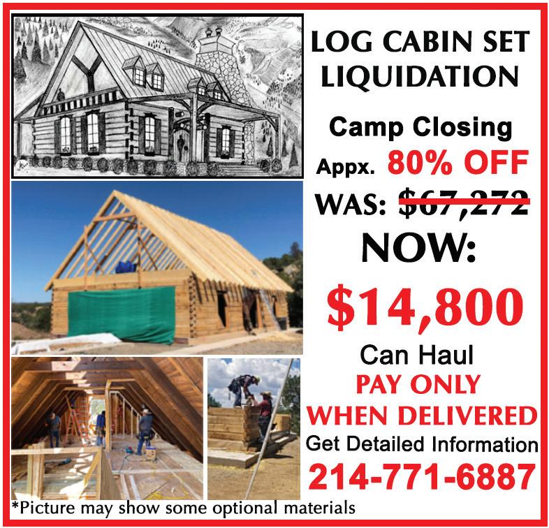 Feed Lot Cattle Whole Angus Beef & Sides $3.99 lb.(Hanging weight) Includes Pro cessing Fees) Using our Patented Technolo gy. Cleanest and Safest Processing. All Bone less High End Cuts. All Meat Vacuumed Packed Contact NSC 325-665-0602 or come by 117 Land Grant Lane, Baird, TX 79504. CROSSOVER LARGE Toolboxes, good condition $300 each obo. 325-3380185 AMERICA’S #1 Safe. Protect your family, valuables and firearms Available. HPS LIB ERTY GUN SAFES 6545 S. US Hwy 377, Stephenville,Tx. 254967-9985 or 254-9774443 www.libertysafe. com NOW $14,800 Aprox 80% off . Camp Log Cab in Set, Pre cut log walls, Main Timber Rafter Ridge Beams,all plans, Can Haul. Pay only on de livery.Get Detailed infor mation @ 214-771-6887 LOG CABIN Set Liq uidation. Camp clos ing. Aprox 80% Off. $ 14,800. Can Haul. Pay only on delivery. Get Detailed information @ 214-771-6887