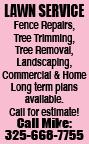 SMALL ACREAGE SERVICE: Mowing, Plowing, Fence, Row Clearing FREE ESTIMATES 325-668-5972
