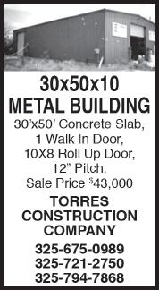 BER? The average re tail price for unleaded gas in August of 1962 was only $0.31 cents per gallon! ~ “Those were the days my friend, I thought they’d never end.....” AQUARIUM SETUPS ANTIQUES & COLLECTIBLES 64 YEAR’S of Play boy Collection. $50 per Issue. 775-513-0314 PRECIOUS MOMENTS COLLECTION 900 pieces 1993-94 through 1999. Includes Anniversary Comemo rative, Membership, Easter Seal, Birthday Club, Sam’s Sets & oth ers. Call for list to 830496-3024 GARAGE SALES OUT WOOD FRAME BUILDINGS OF ALL SIZES Check out our website: MetalShopsAndBarns.com Includes all Labor and Tractor Work and Concrete Slab with Moisture Barrier and Electric Stub. Standard Doors (1) 10x10 Roll Up or 10x8 Garage Door and (1) Steel Walk-in Door. Do not supply pad dirt. Sales 214-930-1029 SHOPS • GARAGES • BARNS EQUIPMENT SHEDS POLICE/FIRE/MILITARY DISCOUNTS CALL FOR PRICING 10429465 October Special 5% Off 10429528 WHOLE AND SIDES OF BEEF 3.99 LB. Hanging Weight (INCLUDES PROCESSING FEES) USING OUR PATENTED TECHNOLOGY CLEANEST AND SAFEST PROCESSING ALL BONELESS HIGH END CUTS ALL MEAT VACUUMED PACKED CALL TODAY TO RESERVE YOUR BEEF 325-665-0602 FEED LOT CATTLE BEEF PROCESSING 117 Land Grant Lane Baird, TX 79504 BEEF DON'T MISS OUT! SATURDAY, OCT 15 th HUGE 8:00AM to 3:00PM EVERYTHING! GARAGE SALE We Have Community HERITAGE PARKS SUBDIVISION HWY 351 • LIBERTY BLVD. Various Furniture, Household & Kitchen Items, Sporting Goods Equipment, Bicycles, Tools, All Size Clothes & SO MUCH MORE!!! 10429566 Are you looking for a building to rent for your next Event? The WAGON WHEEL BUILDING in Tye is now available for Birthdays, Dances, Quinceaneras, Christmas Parties, Weddings, & Showers. It has beautiful wood floors, central heat & air, Large parking lot, western decor, small kitchen, tables & chairs. Reasonable Rent! 1023 North Street • Tye, Texas Call Kathy Stevens: (325) 849-1517 or (325) 583-2661 10429509 • Driver License Restoration • Occupational Licenses • DWI, DWLI, Possession of Marijuana LICENSE SUSPENDED? 3301 N. 3rd • Abilene, TX 79603 325-268-4344 ATTORNEY JOHN W. KENNEDY 10429545 FREE CONSULTATION Complimentary DPS License Status Check LET ME HELP! 10429399 “Star Quality Service” Licensed • Insured TPCL #9129 www.westtexaspestpatrol.com Abilene 325-690-9245 Big Spring 432-263-5460 Colorado City 325-728-5852 Eastland 254-629-8444 Sweetwater 325-236-6668 PEST SERVICES with no contracts and guaranteed results! 10429203