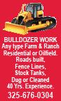 WORK Any type Farm & Ranch, Residential or Oilfield. Roads built, Fence lines, Stock Tanks, Dug or Cleaned. 40 years experience. 325-676-0304