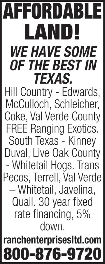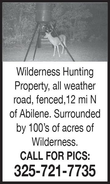 9027 SIX DAY deer hunt with cabin furnished! 325-939-9386 LONG TERM Hunt ers Wanted! • Ran cho Rio Grande — Del Rio,Texas. All: MLD 3, $15/acre, Highway 277 Frontage, water and electric. • 6000 acres, axis, duck andquail, live water: Rio Grande River, Tesquesquite Creek and a canal. • 15-30 minutes from Del Rio International Air port.Water and electric available on each lease. Serious inquiries only, contact:jenna@brask. com