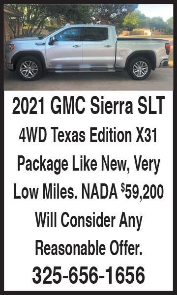PAGE 2 WE’VE MOVED: 3900 N. 1st, Suite #2 (next to Papa John’s Pizza)OCTOBER 13, 2022 (10/13/22 - 10/19/22) WWW.THRIFTYNICKELOFABILENE.COM WWW.THRIFTYNICKELOFABILENE.COM WWW.THRIFTYNICK ELOFABILENE.COM MISCELLANEOUS ‘55 CADILLAC SIX TY SPECIAL, 4 door rare factory Limo Project Car; runs needs brakes, solid body, needs paint, seats good, needs interior & front floors. $4950 obo. Text 325-669-2122. LVN’S STARTING Salary $48,000+ Bene fits. Taylor County Plaza 400 Oak St. Suite 120 Abilene Texas 8 am-12 p.m. and 1pm-5p m. Applications are ac cepted until positions are filled. EEO 325-6741220 taylorcountytex as.org/jobs.asx LAND FOR Sale By Owner, almost 1 Acre land at 1182 Marc, Buf falo Gap, Texas. Elec tricity, water, sewer, are available. 325-2253030, 325-660-5751 COUCH & SOFA. Elec tric BBQ Grill, China Cabi net, 3 piece wood cabinet, Wicker chair & sofa. Office desk, HP computer all in one desktop. HP laptop computer, electric grass trimmer. 325-829-9528.