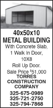 Ft. 40x40 Barndominium $190,000. Concrete Slab, Plumbing, Electri cal, Insulation, Septic Tank, Sheetrock, Paint & many more complete sizes. 325-675-0989, 325-721-2750, 325794-7868
