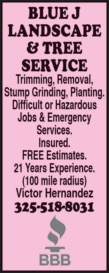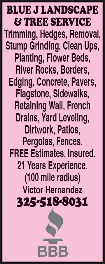 ANDY’S ROOFING. Reasonable Prices, Best Quality in Town! Repairs, Re-Decking, Add-ons, Metal Roof, Windows, Siding Re modeling. Bonded & Insured. Cell 325-6694277, 325-672-1208 SALOMON ROCHA CONCRETE WORK Driveways, Side walks, Storm Cellars, Cinderblock fences. Call 325-236-2543, 325-660-4146 STABILITY IS Key! Are cracks showing up in the Sheetrock and brickwork of your home? Do you have sagging floors and doors that don’t shut? Call Key City Founda tion Repair today to schedule a no obliga tion assessment. 325261-4211 TEXAS WIDE ROOFING SYSTEMS All types of Roofs. Metal High Impact Class 4 - 25, 30, 40 & 50 year Shingles. Hot Tar Modified Roll Roofing, Gravel Roofs, TPO, Roof coating & Metal Carports. Radius of 200 miles. Email: Texaswideroofingsys tems@hotmail.com 325-676-0818 “LEE’S CONCRETE “ METAL BUILDINGS 30x40x10 Metal Building 4 inch Slab, 1- walk in door, 10x8 Roll up door, Sale Price $27,400. 30x30x10 Metal Building, 4 inch Slab, 1 walk in door, 10x8 Roll up door, Sale Price $20,000. 30x50x10 Metal Building, 4 inch slab, 1 walk in door, 10x8 Roll up door, Sale Price $34,500. Call Lee 325-669-0672 AMAZING GRACE REMODELING. No Job To Small. Specializing In Exterior Painting, Flooring, Carpet, Tile, Wood, Vinyl, Paint ing, Drywall, Texture, Plumbing etc... Free Estimates!!! Call Char lie 325-660-2655 THE LORD Bless you and keep you; the Lord make his face shine on you and be gracious to you; the Lord turn his face toward you and give you peace. Numbers 6:24-26 WILL DO yard work & lot cleaning. Residential or commercial. Reason able rates 325—5135578 contact Eddie. BLUE J Landscape & Tree Service. Trimming, Hedges, Removal, Stump Grinding, Cleanups, Planting, Flower beds, River rocks, Bor ders, Edging, Concrete, Pavers, Flagstone, Side walks, Retaining Wall, French Drains, Yard lev eling, Dirtwork, Patios, Pergolas, Fences. Free Estimates. Insured. 21 years experience. (100 mile radius). Victor Her nandez 325-518-8031 AFFORDABLE MOWING & WEED EATING, Clean up & Hauling. Storage Build ings, Garages & Tree limbs. Free Estimates. 325-238-1614