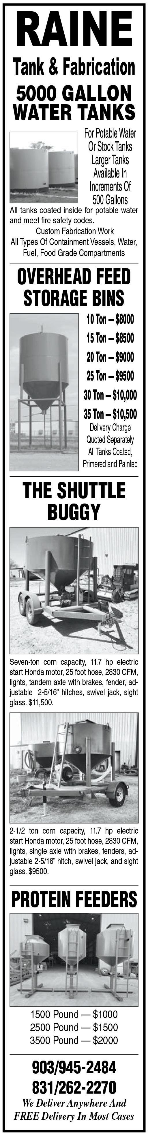 Leather Office Style Chairs; Metal 7 pc Breakfast Set; Shelves; Armoires; Large Library Table; Hand Painted Round Table; File Cabinets; Sofa Tables; Desk; Conference Table; Plus Much More!! GLASSWARE • COLLECTIBLES Waterford; Frankoma; Pyrex; Art Glass; Red & Blue Glasses; Vases; Pots & Pans; Harley Items; Porcelain Cookware; Books; Linens; Nativity Set; Plus More!!! COINS • JEWELRY Carson City Silver Dollars; Misc Costume Jewelry; 14K & Sterling Rings; Coins; Star Trek; Knives; Belt Buckles; Purses; Ammo; Binoculars; Gun Cases; Lucchese Boots; Plus More!! GUNS • OUTDOOR German Mauser w/ Bayonet; Oklahoma Joe’s Smoker; Plus Much More!! Folks, Really Good Merchandise Here!!! 881 E HWY 80 Abilene, TX NEW TAURUS Spec trum 380 auto Pistol, different colors.RE DUCED $200 each. 325-338-0185 WE WOULD like to offer lodging for hunters near Concan, Texas. The cabin sleeps eight with one bathroom and bbq house in Concan, Texas. If you need extra lodging for your hunters please call, 254537-3524. SIX DAY deer hunt with cabin furnished! 325-9399386 ATTENTION LARGE Deer Leases: 13ft. x 16ft. Overhead Tank . Will hold 1600 bushels of corn. Ask ing $5500. 254-4424100 LONG TERM Hunters Wanted! • Rancho Rio Grande — Del Rio,Texas. All: MLD 3, $15/acre, High way 277 Frontage, water and electric. • 6000 acres, axis, duck andquail, live water: Rio Grande River, Tesquesquite Creek and a canal. • 15-30 minutes from Del Rio International Airport.Water and electric available on each lease. Serious inquiries only, contact:jenna@brask.com BLACK POLLED Bulls Angus Limousin & Lim FLEX. 325-669-6452 100% TEXAS Long horns - Heifer Bulls / Registered Bulls and Cows / Heifers - Roping Stock - Trophy Steers • Stonewall Valley Ranch 512/454-0476 or 830/644-2380 TOP DOLLAR!! C&L Cores & Scrap, Automotive Parts, Diesel Parts, Mo tors & Transmis sions, Brass Ra diators, Aluminum Rims & Breakage; & Batteries. CALL 830-220-0960 MULE HARNESS Donkey to sell or trade. Mule is 15 hands, gen tle. Located Old Glory. $1500 obo. 940-6139154 Lv. message.