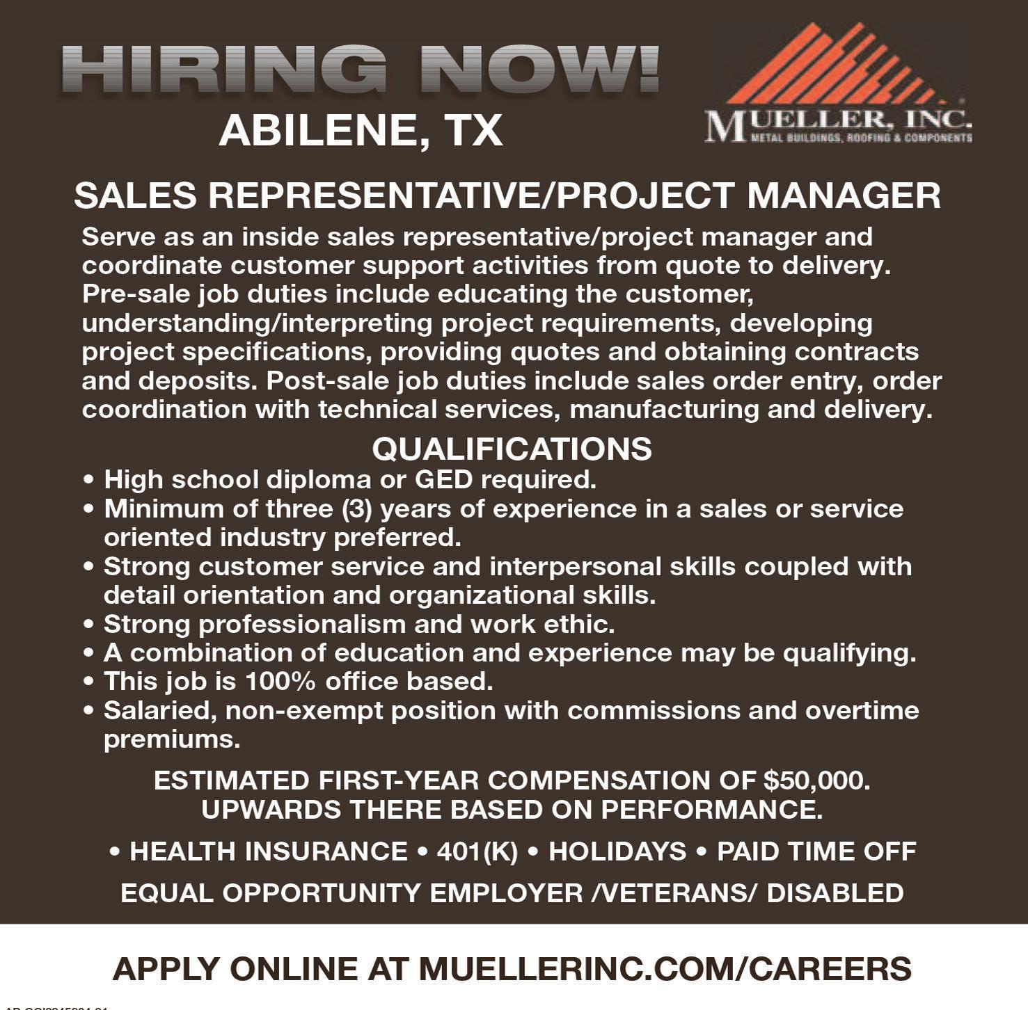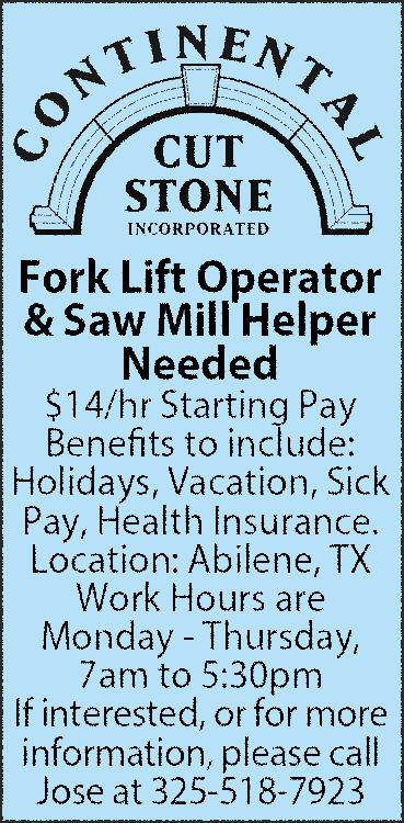 CALL 325-673-4521 PAGE 5www.thriftynickelofabilene.com OCTOBER 20, 2022 (10/20/22 - 10/26/22) ADVERTISE HERE! 325-673-4521 AmClassAbilene.com American Classifieds / Thrifty Nickel © (325) 673-4521 Call us to place your next ad. Remember, not everyone is on social media. VIEW ONLINE AT: www.AmClassAbilene.com www.ThriftyNickelofAbilene.com WANT TO BUY AKC LONG Coat Chi huahua Male; not to exceed over 4-5 lbs; Maturity 1 yr and under. 325-728-8077 WANTED SHORT aluminum Jon Boat. No motor. 325-669-2643 LOOKING FOR 5x8 enclosed Trailer. Call 325-668-1415 HPS- PLASTICS. Si lage/Bunker Covers, Si lage Bags & Machines, Multi-Purpose, Plastic Sheeting, Pond Liners. 254-977-4443 254967-9985 6545 S. US Hwy 377 Stephenville, TX.Made in the USA. WE PAY cash for gold, silver, diamonds & coins! Also purchasing unwanted gift cards! See our ad on the Front Page or call 325-5132743. COME TO Rick’s Collectibles! Buy Sell Trade. 3532 North 6th Abilene. Opened 11 am til 6 pm Abilene’s Hob by Connection since 1991. We have fidget Poppers 3” to 15” Size. Star Wars, Topps, Com ics, Toys. Buy, Sell, and Trade! In the Mall of Abilene! 325-695-3700 4310 Buffalo Gap Rd Ste 1274 Abilene, TX OCTOBER SPE CIAL 5% off. 5 STAR BUILDERS. Wood Frame Buildings of all sizes. We shine above the rest! Shops. Garages, Barns. Police and Military DIS COUNTS Check out our website: MetalShopsAnd Barnes.com Call for pricing. 214930-1029 Abilene State Supported Living Center 2501 Maple • Abilene, TX Visit: AbSSLC.org NOW HIRING FOR OUR ABILENE YARD • CASING HANDS NO EXPERIENCE NEEDED • CDL DRIVERS FOR LAYDOWN MACHINES - 24 HOUR CALL ALL CASING AND LAYDOWN MACHINES24 HOUR CALL, 7 DAYS A WEEK COMPETITIVE WAGES, EXPERIENCED OPERATORS MAKE WELL OVER $100,000.00 COMPANY PAID INSURANCE 401K • PAID VACATION MUST PASS DRUG AND ALCOHOL TEST 4725 Loop 322, Come to Last Building & Go to Dispatch for Appointment (325) 690-0053 Apply Online or Qualified Applicants Can Apply In Person byrdoilfield.com 10429497 LOOKING FOR A CAREER? 10429789 Apply in Person Mon-Fri 8:00am to 3:30pm Or online at www.martinsprocket.com/careers Martin Sprocket & Gear Inc. 4300 FM 18 • Abilene, TX 79602 Now Hiring for Manufacturing Positions Part Finishing Operators to CNC Machine Operators No Experience Necessary - We Will Train You! 2nd Shift: 3pm-11pm + shift differential pay 3rd Shift: 11pm-7am + shift differential pay Excellent Benefits: • Medical • Dental • Paid Time Off (PTO) • Profit Sharing Retirement Plan Applicant must be 18 or older to apply Applicants Must Have: • Good Work Ethic & Reliable • Strong Mechanical Ability • Good Math Skills 10429379 • MISDEMEANOR DEPUTY CLERKCOUNTY CLERK’S OFFICE $29,760.00 plus benefits • FOOD SERVICE DIRECTOR- JUVENILE $40,290.00 plus benefits • DIRECTOR HUMAN RESOURCES AND RISK MANAGEMENT Salary DOE + Benefits • DEPUTY CONSTABLE - BAILIFF $49,000 yr. + Benefits • CLERK JUSTICE OF THE PEACE PCT. 1-2 $30,000-$32,500 (DOE) + benefits • PART TIME CLERK- TEMPORARY PCT. 1-1 $10 per hour • OFFICIAL COURT REPORTER326TH DISTRICT COURT $96,956.11 yr. plus benefits • MATH TEACHER $40,000.00 yr. + Benefits • ASSISTANT CRIMINAL DISTRICT ATTORNEY - CPS AND CIVIL Salary DOE + Benefits Included - Paid 100% • MALE JUVENILE SUPERVISION/ DETENTION OFFICERS$40,000.00 yr. + Benefit • FEMALE/MALE CORRECTIONAL OFFICERS $45,000.00 yr. + Benefits • PATROL DEPUTY - SHERIFF’S OFFICE $49,000.00 yr. + Benefits • HEAVY EQUIPMENT OPERATORPRECINCT #2 $35,000.00 yr. + Benefits • 911 COMMUNICATIONS OPERATOR - SHERIFF $40,000.00 yr. + Benefits • TRANSPORT DEPUTY - SHERIFF OFFICE $49,000.00 yr. + Benefits TAYLOR COUNTY is NOW HIRING - 325-674-1220 https://www.taylorcountytexas.org/Jobs.aspx Full Time benefits include 100% County-paid Employee Medical & Dental Insurance, Paid Life/Disability Insurance, Retirement & Vac/Sick Leave Applications are available on the website at https://www.taylorcountytexas.org/Jobs. aspx or in the Taylor County Plaza, 400 Oak Street, Suite 120, Abilene, Texas. Office hours are 8-12 & 1-5. EOE • LVN Starting Salary: $48,000 yr. + Benefits Apply at 6249 Buffalo Gap Rd. 325-665-7375 Custodians • Pay DOE • Insurance Bus Drivers • Pay DOE • Insurance • Must have CDL with a P and S Endorsement 10429699 WYLIE ISD NOW HIRING! EOE NOW HIRING EOE 10429625 CDL Drivers with Tanker & Hazmat preferred Equipment Operators Laborers Health Insurance and other benefits. Per Diem Paid. 1-830-833-4547