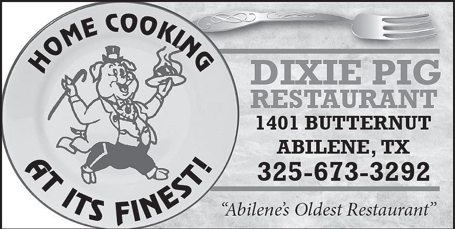 and Much More! FAMILY ESTATE SALE #2 235 Hedges Road Abilene, TX 79605. October 22nd and 23rd. Saturday: 8:30 AM - 1:00 PM and Sunday: 12:00 Noon3:00 PM. HUGE SALE! DON’T MISS OUT! Glassware, Vintage, and collectibles, Hal loween, Thanksgiving, Christmas, and lots of other holiday decor. Floral arrangements, knick knacks and some furniture. Everything in excellent condition and many items are brand new. CASH OR VEN MO ONLY. NO checks or credit cards. FLEA MARKETS FRONTIER FLEA MARKET 781 Walnut, Abilene. Treasures for all ages Tuesday - Saturday 10am-5pm 325-672-2119 ELMDALE FLEA Market 5423 East Hwy 80 Abilene, Rod’s , Reels,Lots of Tools, 2500 Rings and Military Knifes. Opened 7 days a week. 9am - 5pm 325-669-7722 FIRST SATURDAY of the Month . AASR DA Flea Market & Craft Fair. Air Conditioned In door and Outdoor. East of Tye Truck Stop on Access Rd. Vendor In formation Contact 325668-1138, 1023 North St. Tye, Tx FREE GOODIES REDMEN BINGO Ses sions at 7pm and 8:30 pm Open Nightly 7pm & 8:30pm! 7 Days a week. Call for info 325-690-9028. 601 Scott St., Tye Tx. Check us out www.Red menRingoTexas.com and our Facebook Page. ATTENTION: HISTORY Teachers/collectors Na tional Geographic maga zines. Several 1900’s, The Rest AR 40’s, 50’s, 60’s. Take all or none, come by. 2018 Minter Ln., Abilene 9:00am - 6:00pm. Free Goodiies! FURNITURE MOVING - China Hutch, Executive desk, fullsize sofa bed, kitch en table & 4 chairs. 325-244-0007 COUCH & Sofa , Electric BBQ Grill, China Cabinet, 3 piece wood cabinet, Wicker chair & sofa. Office desk, HP Computer all in one desktop. HP Laptop computer, Electric grass trimmer. 325-829-9528 GARAGE SALES OUT • Driver License Restoration • Occupational Licenses • DWI, DWLI, Possession of Marijuana LICENSE SUSPENDED? 3301 N. 3rd • Abilene, TX 79603 325-268-4344 ATTORNEY JOHN W. KENNEDY 10429546 FREE CONSULTATION Complimentary DPS License Status Check LET ME HELP! 10429529 WHOLE AND SIDES OF BEEF 3.99 LB. Hanging Weight (INCLUDES PROCESSING FEES) USING OUR PATENTED TECHNOLOGY CLEANEST AND SAFEST PROCESSING ALL BONELESS HIGH END CUTS ALL MEAT VACUUMED PACKED CALL TODAY TO RESERVE YOUR BEEF 325-665-0602 FEED LOT CATTLE BEEF PROCESSING 117 Land Grant Lane Baird, TX 79504 BEEF“Star Quality Service” Licensed • Insured TPCL #9129 www.westtexaspestpatrol.com Abilene 325-690-9245 Big Spring 432-263-5460 Colorado City 325-728-5852 Eastland 254-629-8444 Sweetwater 325-236-6668 PEST SERVICES with no contracts and guaranteed results! 10429204 10429331 10429488 WOOD FRAME BUILDINGS OF ALL SIZES Check out our website: MetalShopsAndBarns.com Includes all Labor and Tractor Work and Concrete Slab with Moisture Barrier and Electric Stub. Standard Doors (1) 10x10 Roll Up or 10x8 Garage Door and (1) Steel Walk-in Door. Do not supply pad dirt. Sales 214-930-1029 SHOPS • GARAGES • BARNS EQUIPMENT SHEDS POLICE/FIRE/MILITARY DISCOUNTS CALL FOR PRICING 10429466 October Special 5% Off 10429726 ATTENTION DISABLED VETS! I am starting a small Equine Therapy Clinic for the Disabled Veteran. I need help, advice, and a few clients. Also looking for 2 more horses. If you would like to be a part of this, please call Tom at 325-668-5972 10429648