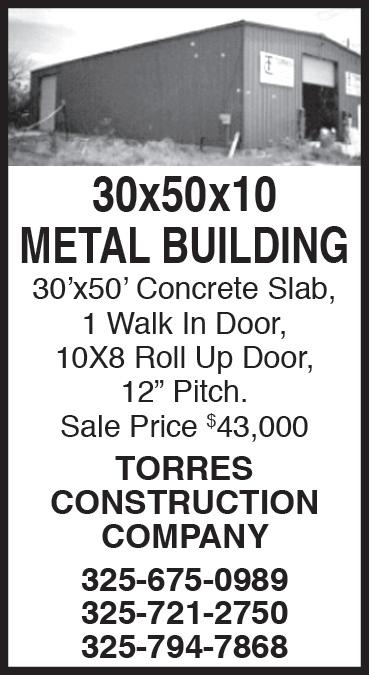 30x40x10 Metal Building 4 inch Slab, 1- walk in door, 10x8 Roll up door, Sale Price $27,400. 30x30x10 Metal Building, 4 inch Slab, 1 walk in door, 10x8 Roll up door, Sale Price $20,000. 30x50x10 Metal Building, 4 inch slab, 1 walk in door, 10x8 Roll up door, Sale Price $34,500. Call Lee 325-669-0672 30X30 $110,000 BARNDOMINIUM, concrete slab, Plumb ing, Electrical, Insu lation, Septic tank, sheetrock, Paint, 2 bedrooms, bathroom, kitchen. Many more complete sizes. 325675-0989, 325-7212750, 325-794-7868
