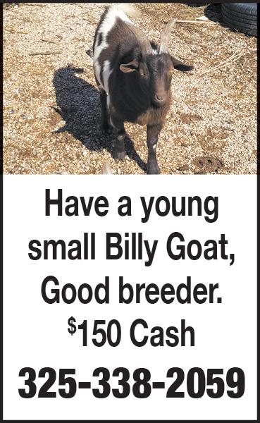 EXPERI ENCED Hunters Must be in good physical condition, have clean driving record, clean criminal record and provide references. Need seasonal or part time guides for profes sional hunting service. Hunt multiple species and earn on average from $300-$425 per day. Email resume to jroche@magnumguide service.com HORSES HORSE SALE! Cle burne, Texas. Every Wednesday Night 6pm. Selling Good Riding Horses Also, Top Loose Horse Mar ket. 254-744-5563, 469-595-6870. WILL BUY Horses of All Kinds - Truck load Lots of Al falfa Hay Avail able Year Round - Cattle Hauling - Truck or Goose neck - Fully Insured - J.L. Keeney 432-5582679 (h) 432556-0555 (m) HORSES - Bought, Sold, and traded / Any kind • Any time! - G.A. Gossett 806-570-1309 TRAINING FOR Horse & Rider - NRHA, NCHA, SHOT competi tor - Coach - ClinicianJudge • David Maltais / 325-201-3882 RANCHES FOR SALE VANISHING TEX AS river cruises with three boats, two houses, pool, large dock and office, six acres on Lake Bu chanan. $4M. cob branch1@gmail.com 512-556-3890 SMALL 10-ACRE ranchito for sale by owner, joining a large ranch in the beautiful Big Bend area of South west Texas surrounded with mountains, 3000 ft. altitude. Three bed room, two bath home with garage, basement, workshop, barns, new fencing, good well and low taxes because of AG Exemption. $250,000. Call 432-3865854 SOUTHWEST OKLAHOMA - Hunt ing/Cattle Ranch • 480 Acres at $1,825/acre. CALL 580-678-0662 SHEEP 100 WHITE ewe lambs, year-lings, 85 pound average. 100 black headed ewe lambs, 85 pound aver age. 300 white ewe lambs, 75 pound aver age. 325-234-0206 COMMERCIAL DORPERS - 50 ewe lambs, eight months old / 25 ewes, two years old, bred. (512) 680-1133. HUNTING & FISHING LOOKING FOR place to hog hunt near Abilene. Leave voice mail 817-253-0853 BEARDLESS WHEAT Hay. 277-2281 NOW $14,800 Aprox 80% off . Camp Log Cabin Set, Pre cut log walls, Main Timber Rafter Ridge Beams,all plans, Can Haul. Pay only on delivery.Get Detailed information @ 214-771-6887 LOG CABIN Set Liq uidation. Camp clos ing. Aprox 80% Off. $ 14,800. Can Haul. Pay only on delivery. Get Detailed information @ 214-771-6887 CUSTOM JEWEL RY! Use your old, heir looms and make them new again! call 325513-2743. Big Country Gold. 4541 Catclaw Drive. ROMAGNOLA CATTLE Not A New Breed Or A Combination Of Breeds ... A Prov en Breed Proud To OfferAmeri can Cattlemen Janelle Yates — 325/456-5099 HAY FOR Sale Call for Price & type. 325-6421215 BULLDOZER WORK Any type Farm & Ranch, Residential or Oilfield. Roads built, Fence lines, Stock Tanks, Dug or Cleaned. 40 years experience. 325-676-0304 USED T-POST $2.50 each. Hog Panels $20 each. Sucker Rods. 940-256-3059 30X30 $110,000 BARNDOMINIUM, concrete slab, Plumb ing, Electrical, Insu lation, Septic tank, sheetrock, Paint, 2 bedrooms, bathroom, kitchen. Many more complete sizes. 325675-0989, 325-7212750, 325-794-7868 FARM DOGS & PUPPIES GREAT PYRENEES from working parents$300 • (830) 708-5930 Marion, TX BLUE TICK and black and tan hound dog puppies, working parents bred to trail on dry ground — three males, two females. First shots, ten weeks old, ready to go (806) FARM/HEAVY I BUY JUNK Vehicles - running or not! Must have title. * 325-5140427 * Get some CA$H Today! ATTENTION DIS ABLED VETS! I am starting a small Equine Therapy Clinic for the disabled Veteran. I need help, Advice, and a few clients. Also look ing for 2 more horses. If you would like to be a part of this, Please Call Tom @ 325-668-5972 I BUY JUNK Vehicles - running or not! Must have title. * 325-5140427 * Get some CA$H Today! FELONY PROSECU $65,000-$85000 yr + DOE + benefits Taylor County Plaza 400 Oak St. Suite 120 Abilene Texas 8 am-12 pm and 1pm -5 pm Ap plications are accepted until positions are filled. DEPUTY CONSTA $49,000 .yr+benefits. Taylor County Plaza 400 Oak St. Suite 120 Abilene Texas 8 am-12 pm and 1pm -5 pm Applications are accepted until po sitions are filled.EOE 1, 2022 2:39 pm (GMT -5:00) Powered by TECNAVIA NOTICE of PUBLIC SALE to satisfy a landlord’s lein. The auction will begin at 11 am 11-3-22 at A2Z Self Storage 2450 Union Lane, Abilene, TX 79601. Property will be sold to the highest bidder for cash. Cleanup and removal of all property is required. Property includes untis of the following tenants: Dezeray Adams, Shameka Appel, Donald Depew, and Ray Richards. Boston Terrier Pups- 6 Males, 5 Females Available 1st shots, dewormed, Health check incl., Ready Now! Call 325-514-0197 German Shepherd AKC Pups (806)292-5438 (806)-292-7445 website: www.wtxk9.com Lost in COUNTRY PLACE S. between 1102-2300 Buffalo Gap Rd (FM89 Abilene, TX), White w/calico head/tail. Name-Betsy 13 yrs. Chipped. REWARD. 325-669-2818 LARGE MACHINERY AUCTION Thursday, November 3 @ 9:30 AM Montgomery Tractor & Auction 19842 US Hwy 277 E Seymour, TX (940) 888-3437 Selling 75 tractors & all types farm, ranch & construction machinery. Consignments Accepted - Hauling Available Call for more info or visit montgomerytractor.com Online and onsite bidding availalbe Mark Montgomery, Tx 10053 Volleman Dairy Processing LLC seeks Business Development Specialist in Gustine, TX with Bachelor’s degree in Business Management, Marketing, or related and 6 months project management experience. Interested candidates should submit a resume & cover letter to HR, 15400 TX-36, Gustine, TX 76455. Selling Your Stuff?a Classified ad gets you exposure Get Results Advertise In The Classfiieds FIND IT SELL IT BUY IT Place your classified ad today.cars garage sales tickets antiques motorcycles computers boats sports equipment pets instruments jewelery furniture auctions collectibles jobs appliances yard sales JOIN US AS WE GROW! BALLINGER MEMORIAL HOSPITAL DISTRICT ALL FULL-TIME POSITIONS OFFER THE FOLLOWING BENEFITS: or Apply in Person - 608 Ave B, Ballinger, Texas For more information and to apply visit www.ballingerhospital.org Email diannem@bmhd.org Contact Human Resources at 325-365-4952 √ Medical √ Dental √ Vision √ TCDRS Reti