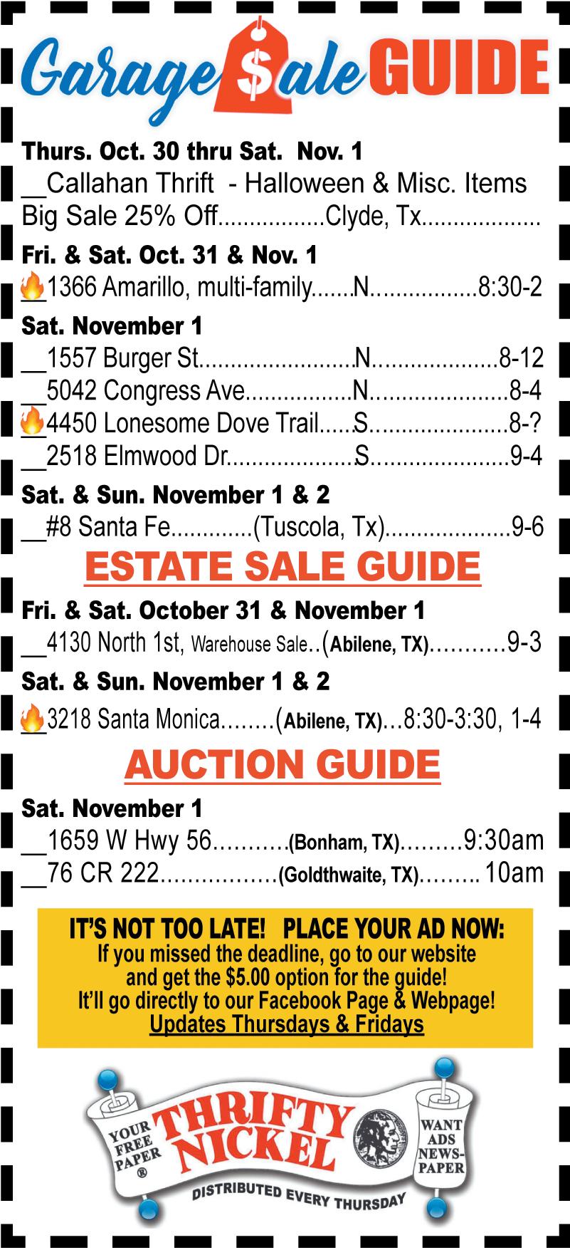 Pursuant to Chapter 59, Texas Property Code, this is a notice of public auction in order to satisfy a landlords lien of personal property. The auction will be held www.storageauctions.com for The Storage Place Abilene two locations. Bidding will open on 10/27/25 at 12:00 PM and will close on 11/10/25 at Credit card is required for the clean out deposit. Seller reserves the right to withdraw the property at any time before the sale. Unit items are sold as-is to the highest bidder. Unless stated otherwise the description of the contents are household goods and furnishings. Property includes the contents of spaces of the following tenants: 5050 Fairmont St, Abilene, 79605 - John 1930 N. 1st , Merkel, 79536 - Sarah Munzer