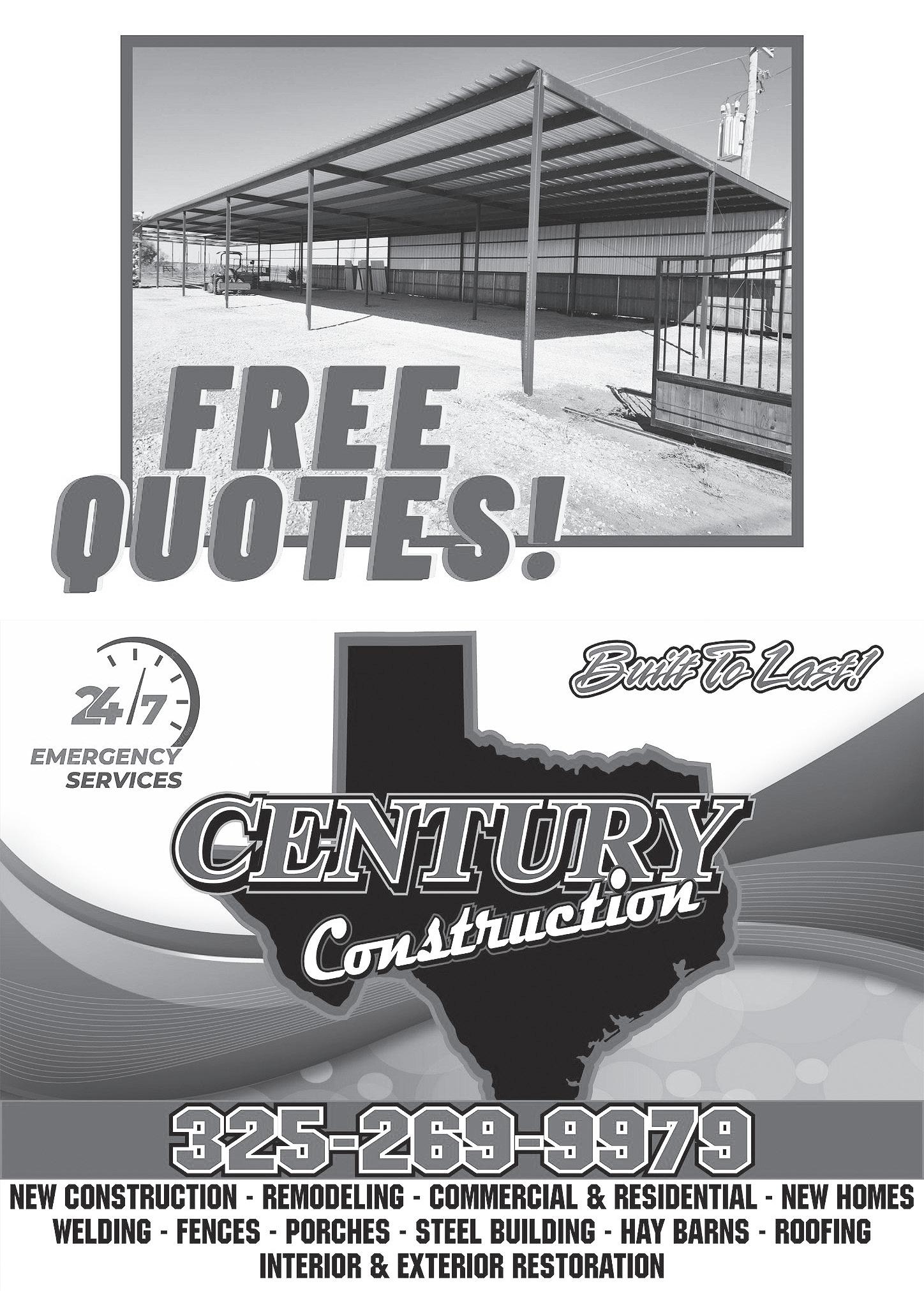 WE ARE HIRING /Century Construction • Steel Workers + New Construction / Remodel Helpers, 40 Hours per week, Pay dependent on experience, CALL 325269-9979