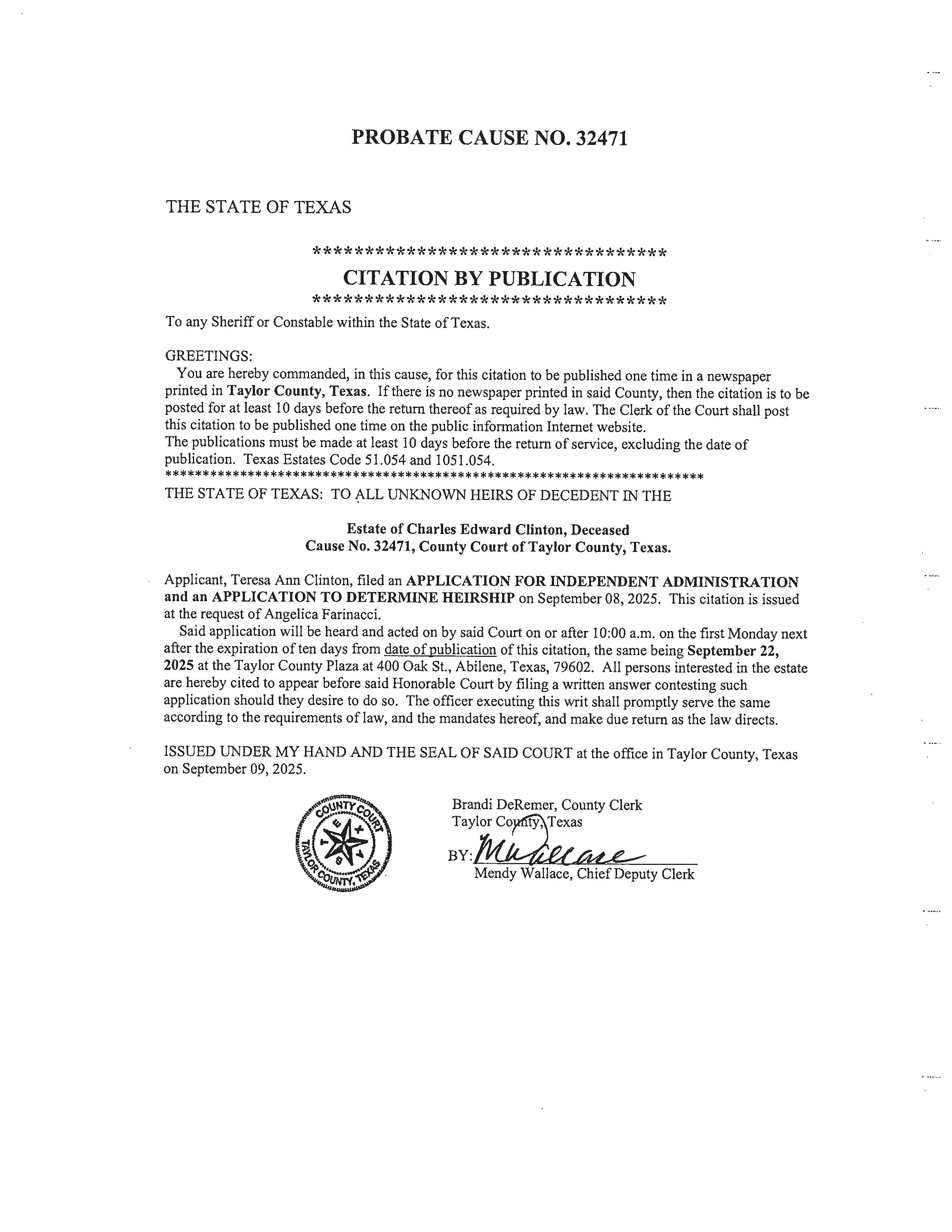 ISSUED UNDER MY HAND AND THE SEAL OF SAID COURT at the office in Taylor County, Texas on October 16, 2025. Brandi DeRemer, County Clerk Taylor County, Texas BY: Mendy Wallace Mendy Wallace, Chief Deputy Clerk