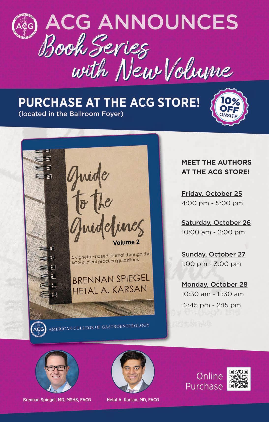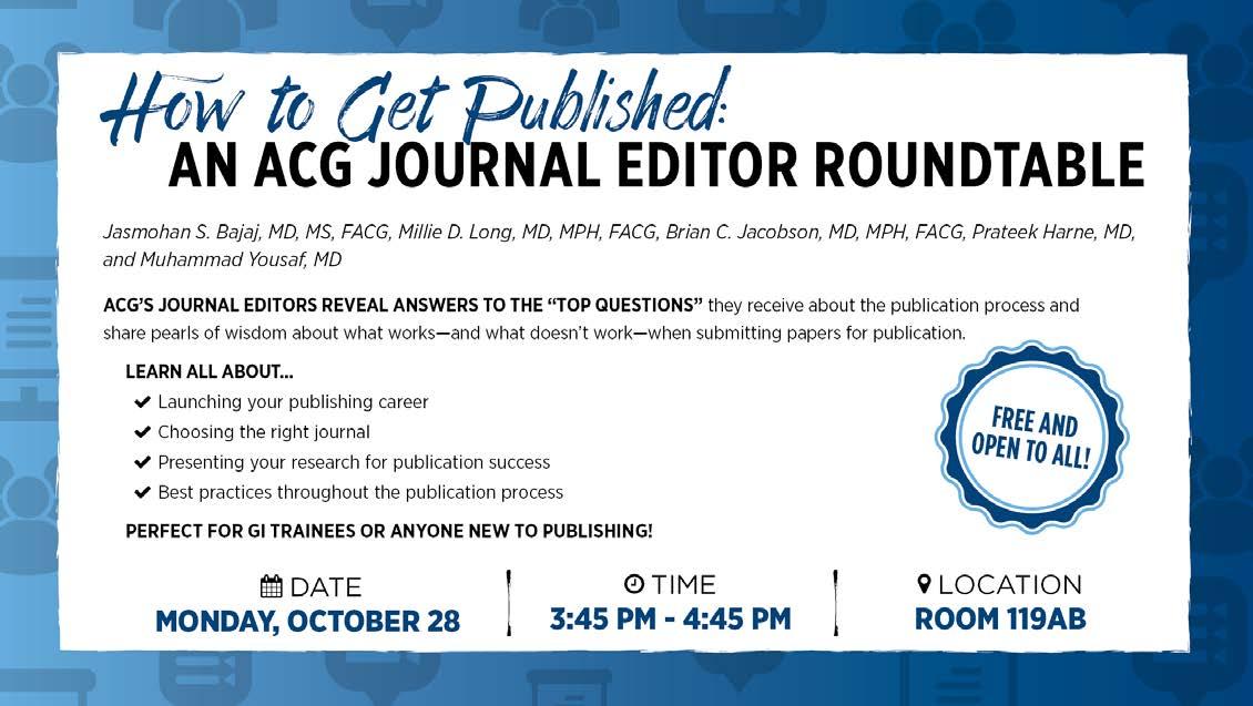 If you have burning questions about how to get your research published, there will be a special Monday afternoon session from 3:45 pm – 4:45 pm on How to Get Published: An ACG Journal Editors’ Roundtable featuring Jasmohan Bajaj, MD, MS, FACG, Millie D. Long, MD, MPH, FACG, Brian C. Jacobson, MD, MPH, FACG, Prateek S. Harne, MBBS, MD, and Muhammad N. Yousaf, MD. This session is free to all and perfect for GI fellows or anyone new to publishing.