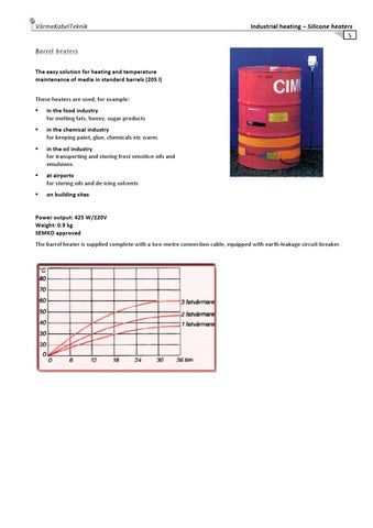 Power output: 425 W/220V Weight: 0.9 kg SEMKO approved The barrel heater is supplied complete with a two‐metre connection cable, equipped with earth‐leakage circuit‐breaker.