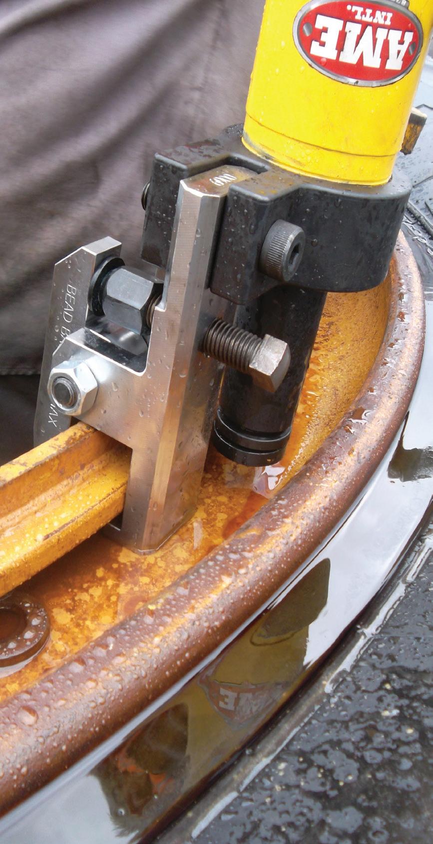 • Tool clamps hydraulically to the wheel and then breaks bead with 11 tons of force