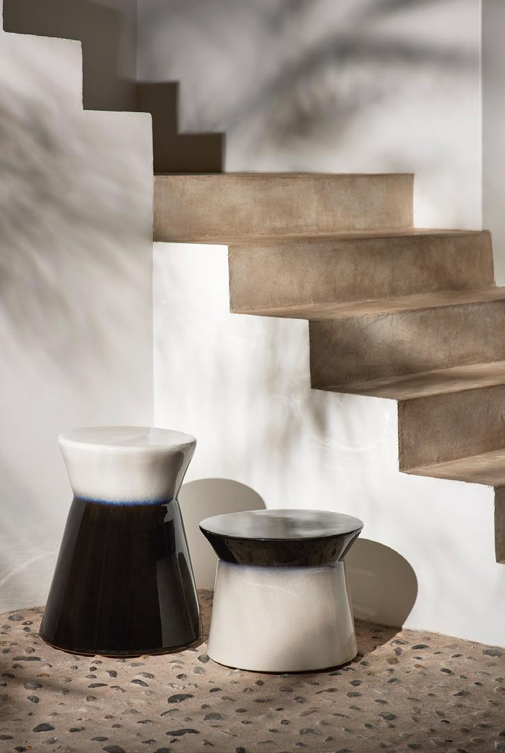 Les tabourets peuvent aussi être utilisés comme table d’appoint. Des pièces de mobilier déclinées en noir ou en blanc, sublimées par des finitions brillantes.