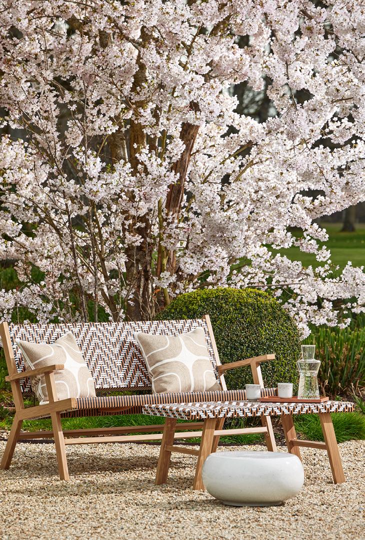 L’intérieur et l’extérieur se confondent : on ouvre les fenêtres, on installe le mobilier outdoor Sillage dans le jardin pour profiter des températures plus clémentes. Banquettes, fauteuils et tabourets se pressent autour d’une table basse aux tressages réguliers. Le daybed attend que le temps ralentisse, invitant à la paresse avec ses formes ondulantes, son matelas tissé et ses coussins brodés.