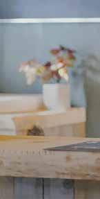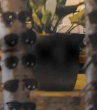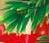 Tablåer av julepynt henger ned fra taket, de er mildt grønne, svalt ferskenfargede og kjølig blekblå. Grønne planter og blomstrende krukkevekster står tett i tett og minner om at vi er i et blomsterverksted. Midt i det hele et generøst pyntet juletre med spir i toppen.