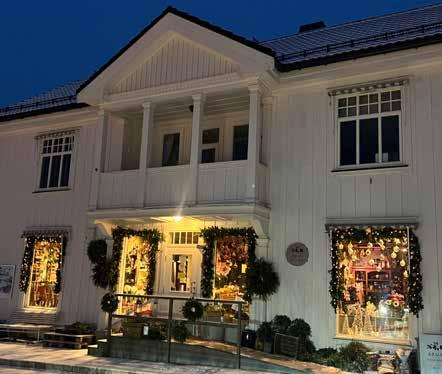 Inngangspartiet er dekorert med lubne kranser bundet av gran, furu og einer og rundt vinduene henger vintergrønne ranker med lyslenker som dekor.