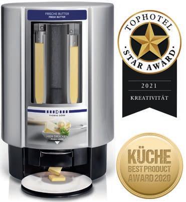 Diese attraktive Lösung erfüllt darüber hinaus den höchsten Hygienestandard, da die Gäste nicht direkt mit der Butter in Berührung kommen. Dank einem energiesparenden Behälter mit Eiswasser im Inneren bleibt die Butter bei 5 °C bis zu 5 Stunden kühl. Die Reinigung erfolgt problemlos, alle Einzelteile sind spülmaschinengeeignet.