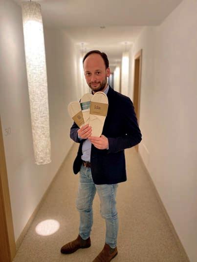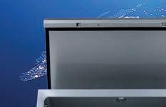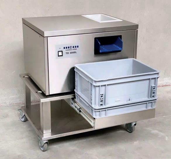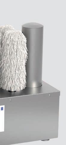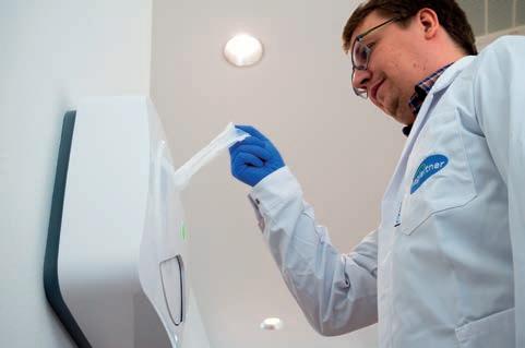 Steuerbar ist die Erfindung unter anderem digital. Eine App bietet bspw. einen Haltbarkeitswächter: „Das Desinfekti onstuch darf nicht ablaufen, sonst büßt es seine Wirkung ein“, schildert die Chemikerin und Desinfektionsexpertin Kerstin Heine. Generell kann der Spender Selbstauskunft geben, Anwendungsdaten übermitteln – online über den Füllstand und Energiestatus informieren. Das Gerät läuft wahlweise mit Netzstrom, Akku oder recycelbarer Energie einheit; laut Herstellerangaben reichen Akku und Energie einheit für je 20.000 Betätigungen.