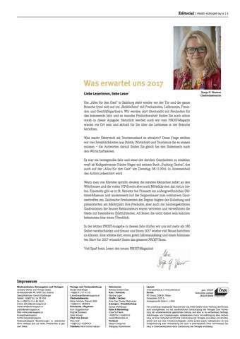 Liebe Leserinnen, liebe Leser Die „Alles für den Gast“ in Salzburg steht wieder vor der Tür und die ganze Branche freut sich auf ein „Stelldichein“ mit Produzenten, Lieferanten, Freunden und Geschäftspartnern. Wir werden dort überrascht mit Neuheiten für das kommende Jahr und so manche Produktneuheit finden Sie auch schon vorab in dieser Ausgabe. Natürlich werden auch wir vom PROST-Magazin wieder vor Ort sein und aktuell für Sie über die Leitmesse in der Branche berichten. Was macht Österreich als Tourismusland so attraktiv? Diese Frage stellten wir vier Persönlichkeiten aus Politik, Wirtschaft und Tourismus die es wissen müssen – die Antworten darauf finden Sie gleich bei den Statements nach den Wirtschaftsseiten. Es war ein bewegendes Jahr und einer der darüber Geschichten zu erzählen weiß ist Kultgastronom Günter Hager mit seinem Buch „Fucking Gastro“, das auch auf der „Alles für den Gast“ am Dienstag, 08.11.2016, in Anwesenheit des Autors präsentiert wird. Wenn man von Kärnten spricht, denken die meisten Menschen sofort an den Wörthersee und die vielen VIP-Events aber auch Mittelkärnten hat viel zu bieten. Einerseits gibt es in St. Salvator bei Friesach ein außergewöhnliches Oldtimer-Museum und andererseits lud der Seppenbauer zum exklusiven Gourmettreffen ein. Zahlreiche Produzenten der Region folgten der Einladung und präsentierten am Marktplatz ihre Produkte, aber auch die haubengekrönten Gastronomen der Jeunes Restaurateurs waren vertreten und verwöhnten die Gäste mit besonderen Köstlichkeiten. All Jenen die nicht dabei sein konnten bekommen hier einen Überblick. In der letzten PROST-Ausgabe in diesem Jahr dürfen wir uns mit mehr als 180 Seiten verabschieden und freuen uns Ihnen 2017 wieder viel Neues berichten zu können. Eine schöne Zeit, einen guten Jahresausklang und einen fulminanten Start für 2017 wünscht Ihnen das gesamte PROST-Team. Viel Spaß beim Lesen des neuen PROST-Magazins!