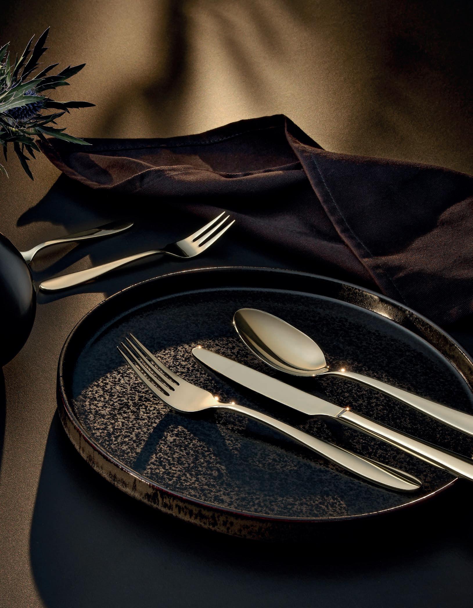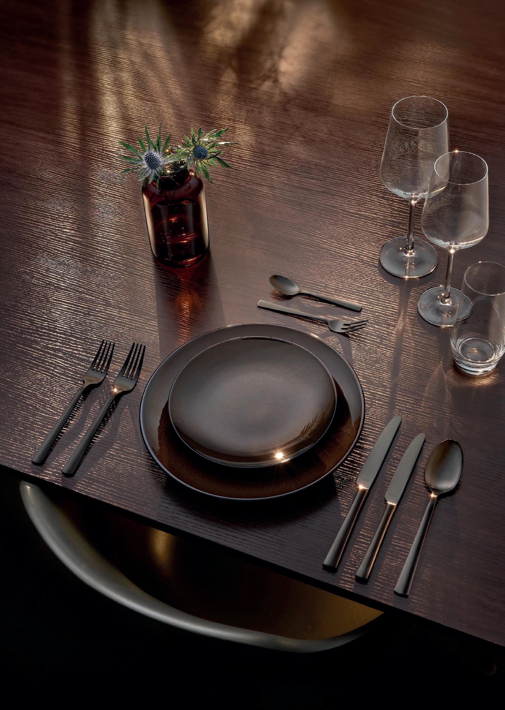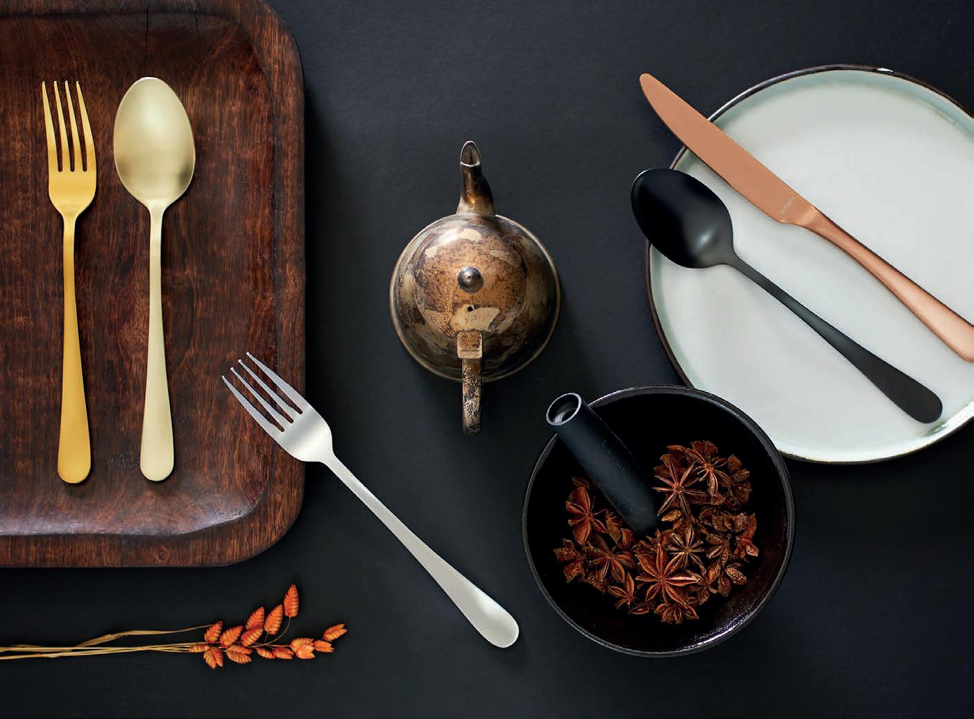 This season’s most versatile PVD colours bring a touch of warmth and understated glamour to the table. Expertly cut from the finest materials and polished to a sublime finish. PVD (Physical Vapor Deposition) means several layers of titanium coating were added to give the cutlery a vibrant colour that makes a true statement on any table. Whatever your choice, mirror or matt, daring black or glamorous copper, our coloured cutlery collection will be the talk of the table.