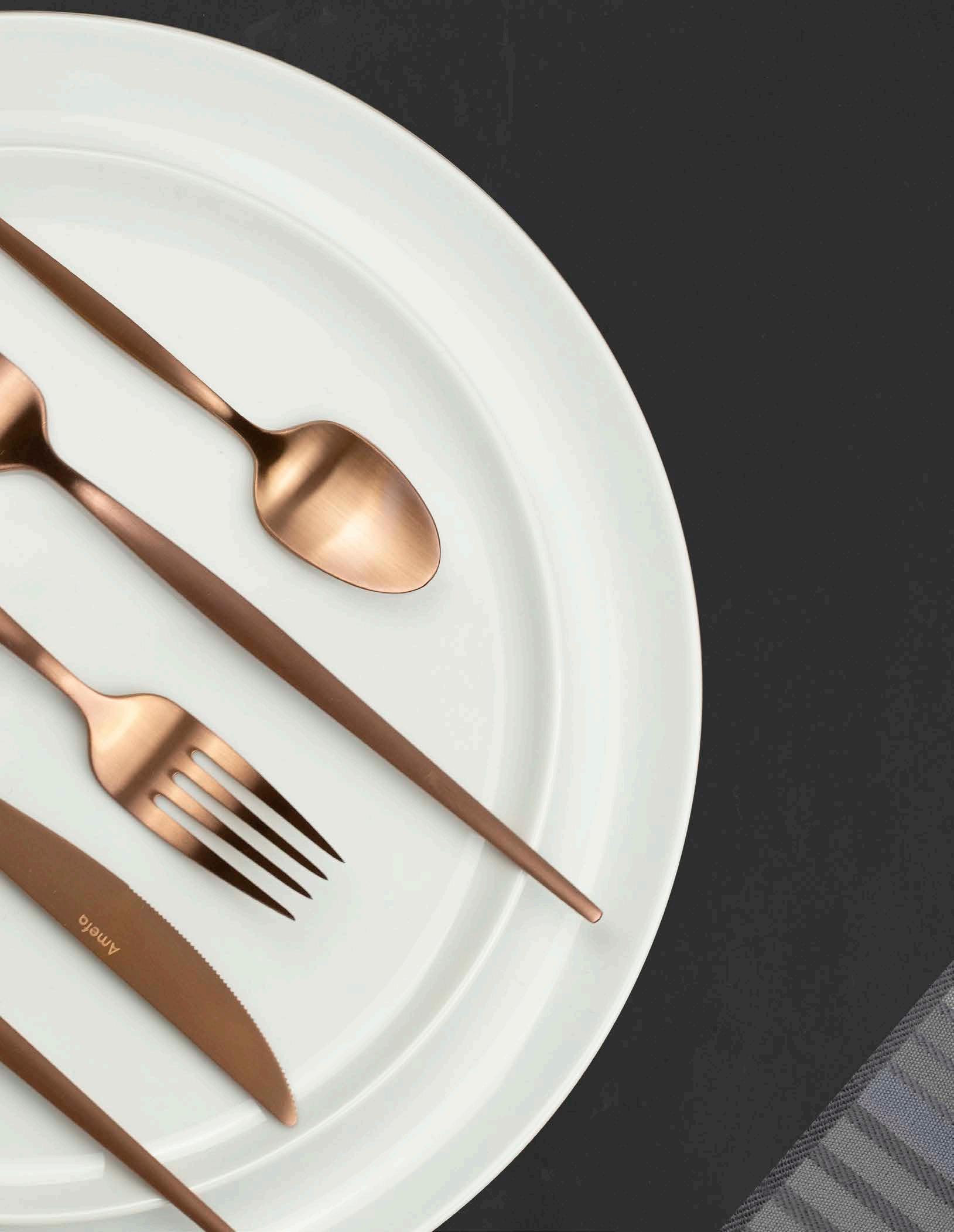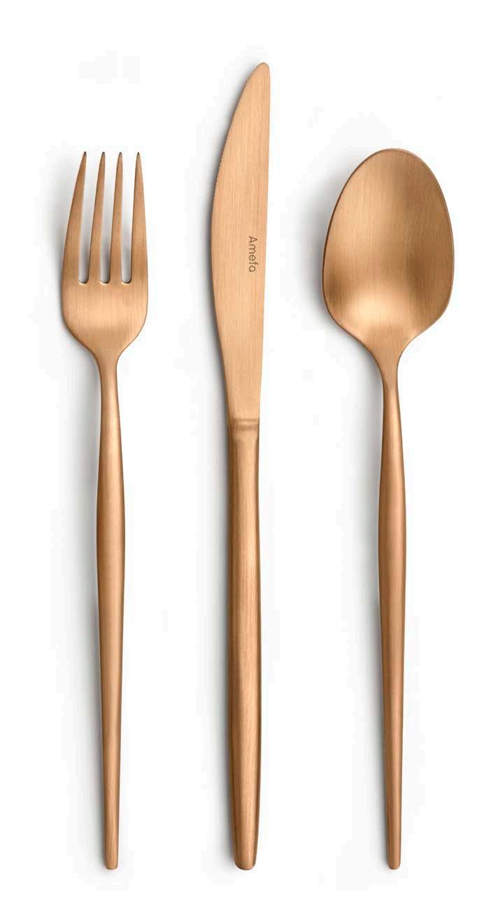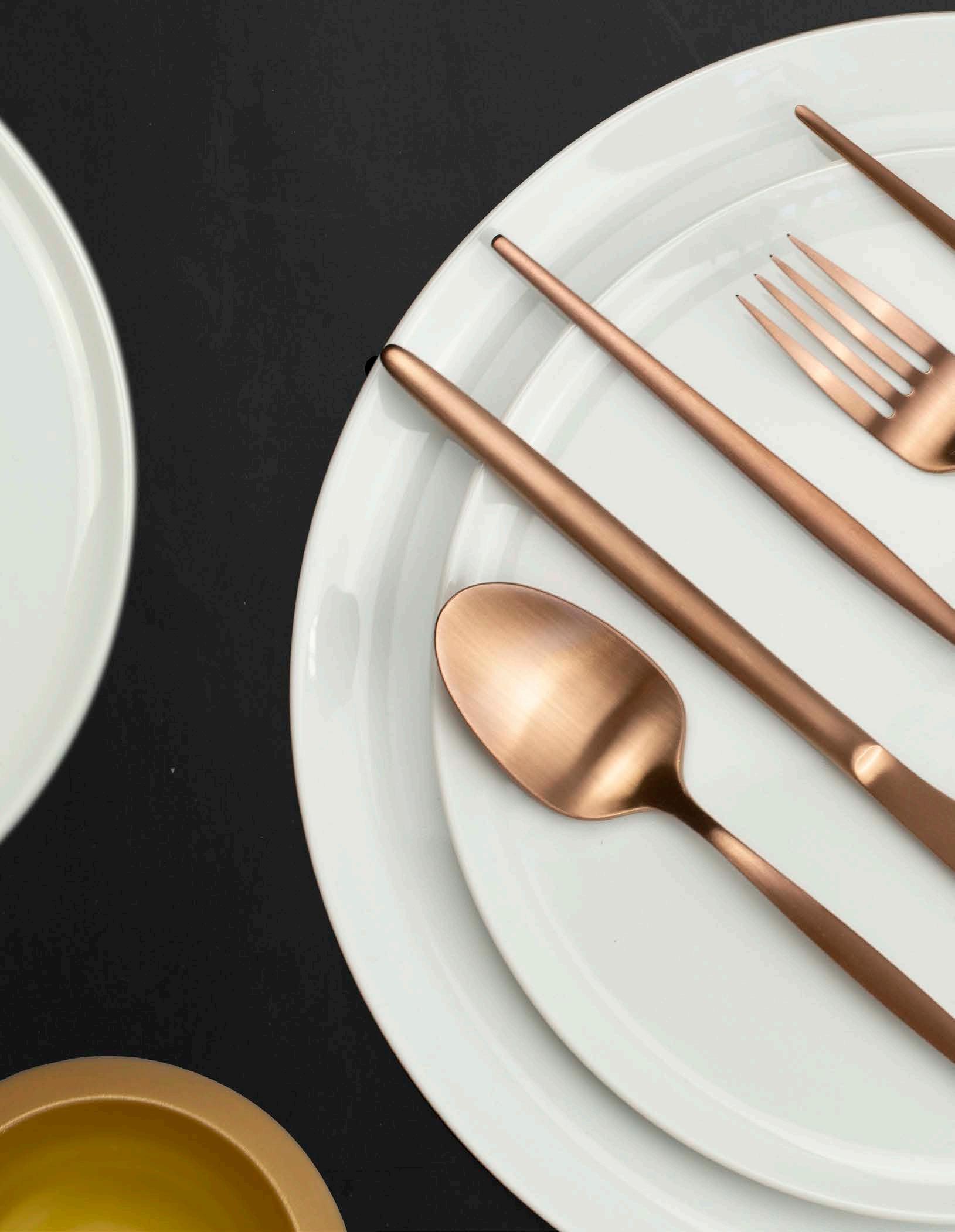 This season’s most versatile PVD colours bring a touch of warmth and understated glamour to the table. Expertly cut from the finest materials and polished to a sublime finish. PVD (Physical Vapor Deposition) means several layers of titanium coating were added to give the cutlery a vibrant colour that makes a true statement on any table. Whatever your choice, mirror or matt, daring black or glamorous copper, our coloured cutlery collection will be the talk of the table.