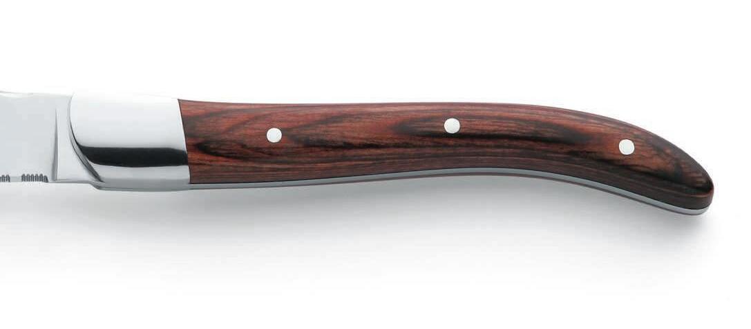 At the very end of the production process, the SABATIER TROMPETTE knives benefit from a manual leather polishing of the blade edges. This careful operation enhances the cutting performances and guarantees an excellent finishing.