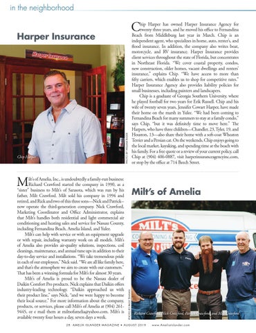 ilt’s of Amelia, Inc., is undoubtedly a family-run business: Richard Crawford started the company in 1990, as a “sister” business to Milt’s of Sarasota, which was run by his father, Milt Crawford. Milt sold his company in 1994 and retired, and Rick and two of this three sons—Nick and Patrick-now operate the third-generation company. Nick Crawford, Marketing Coordinator and Office Administrator, explains that Milt’s handles both residential and light commercial air conditioning and heating sales and service for Nassau County, including Fernandina Beach, Amelia Island, and Yulee. Milt’s can help with service or with an equipment upgrade or with repair, including warranty work on all models. Milt’s of Amelia also provides air-quality solutions, inspections, coil cleanings, maintenance, and annual tune ups in addition to their day-to-day service and installations. “We take tremendous pride in each of our employees,” Nick said. “We are all like family here, and that’s the atmosphere we aim to create with our customers.” That has been a winning formula for Milt’s for almost 30 years. Milt’s of Amelia is proud to be the Nassau dealer of Daikin Comfort Pro products. Nick explains that Daikin offers industry-leading technology. “Daikin approached us with their product line,” says Nick, “and we were happy to become their local source.” For more information about the company, products, or services, please call Milt’s of Amelia at (904) 2619445, or e mail them at miltsofamelia@yahoo.com. Milt’s is available twenty four hours a day, seven days a week.