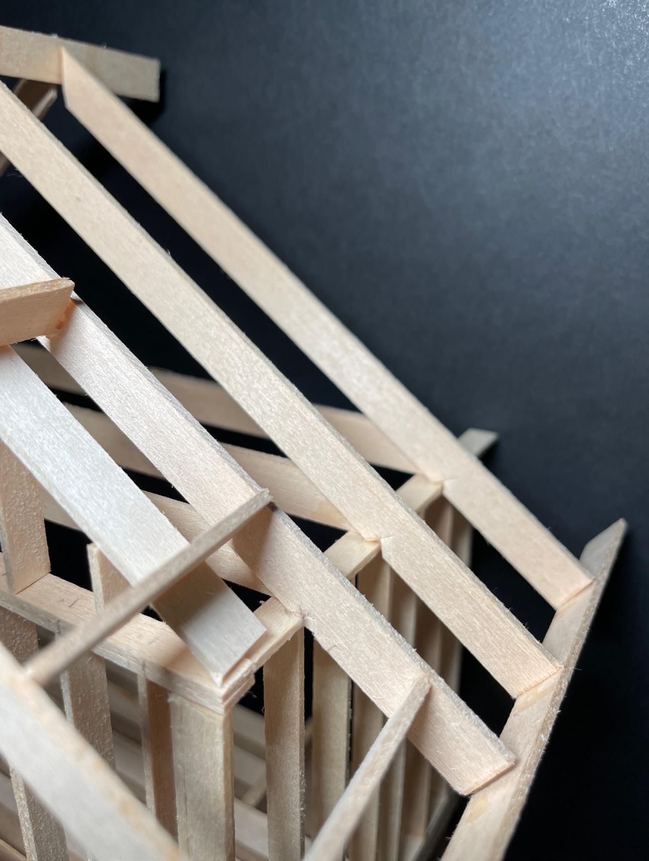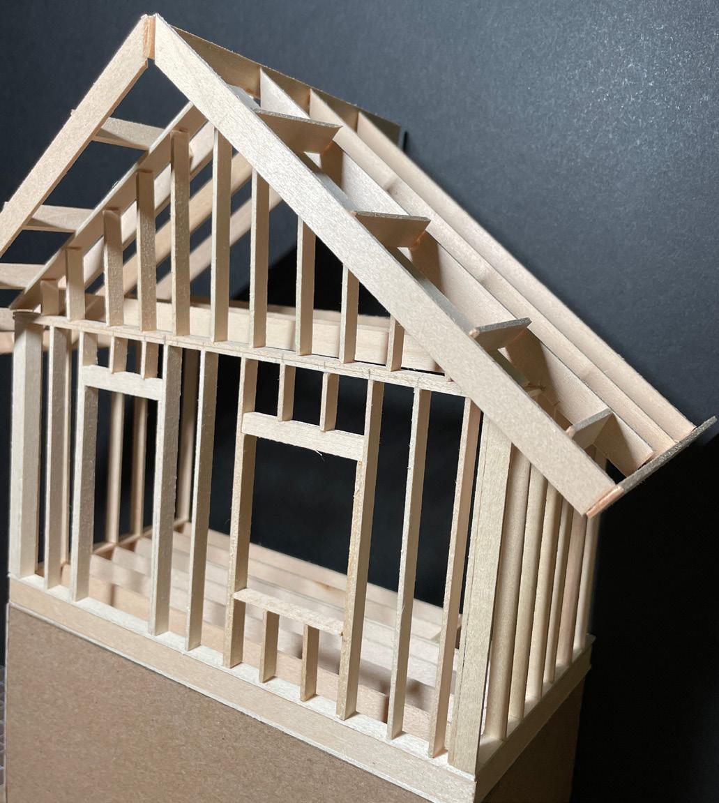 To understand light wood framing, students constructed a basswood model that shows different aspects of a single-story gabled roof cabin. Several terms were identified during the construction, such as sole and double top plates, double headers and sills, king studs, jack studs, and cripple studs.