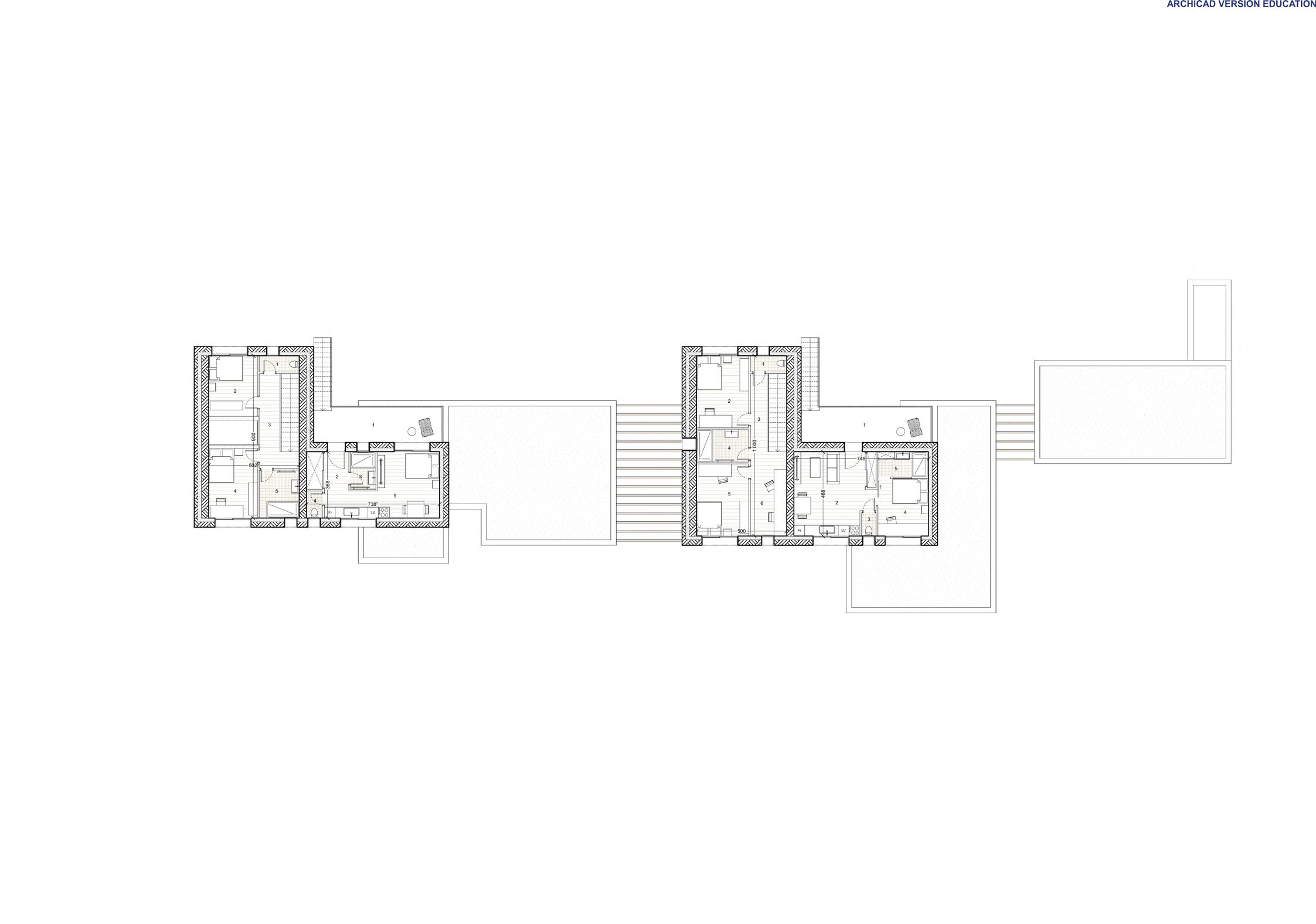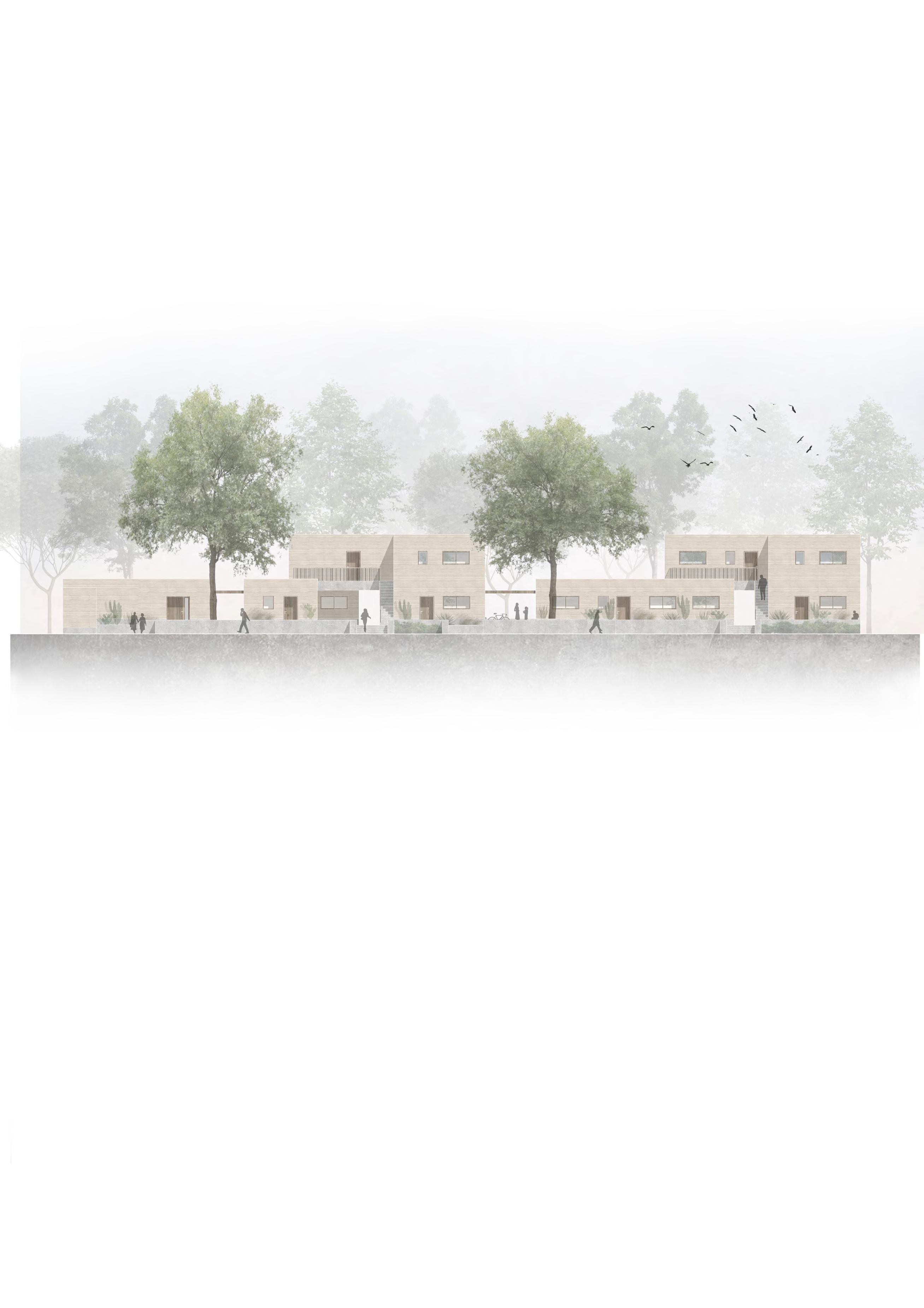 Le projet est composé de 6 logements intermédiaires, d’une salle commune et d’une piscine partagée. Ces logements sont créés à partir de blocs superposés entre-eux afin de créer des passages, des renfoncements et des espaces de transition. Créer des logements intermédiaires permet de créer un lien social entre voisins, en alternant entre espaces privés et espaces communs. Les transitions se font de manière plus abstraite, tout en ayant son propre espace d’entrée.
