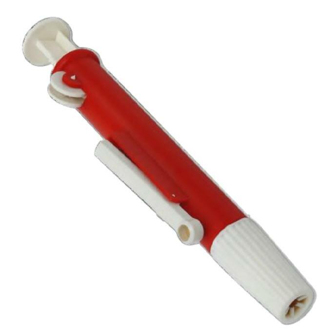 The knurled thumb wheel can be rotated to draw up or dispense liquids while the releaser may be pushed in for zip-quick emptying. The molded chuck has a silicon rubber collet inside to hold various pipettes of standard sizes. It resists acids and alkalies and can be easily disassembled for thorough cleaning.