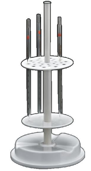 Molded in Polypropylene, this unique Stand holds a maximum of 96 pipettes and rotates on a central vertical axis for convenient selection of any particular pipette. The lower rotating disc has four concentric troughs with tapered sides and open bottoms which cradle the pipette tips protectively and permit water drops to run off. The upper disc has a grid pattern concentric with the bottom disc and keeps the pipettes vertical. Liquids draining off the pipettes are retained on the top of the stationary base by the outer ring. This stand can be easily disassembled and reassembled.