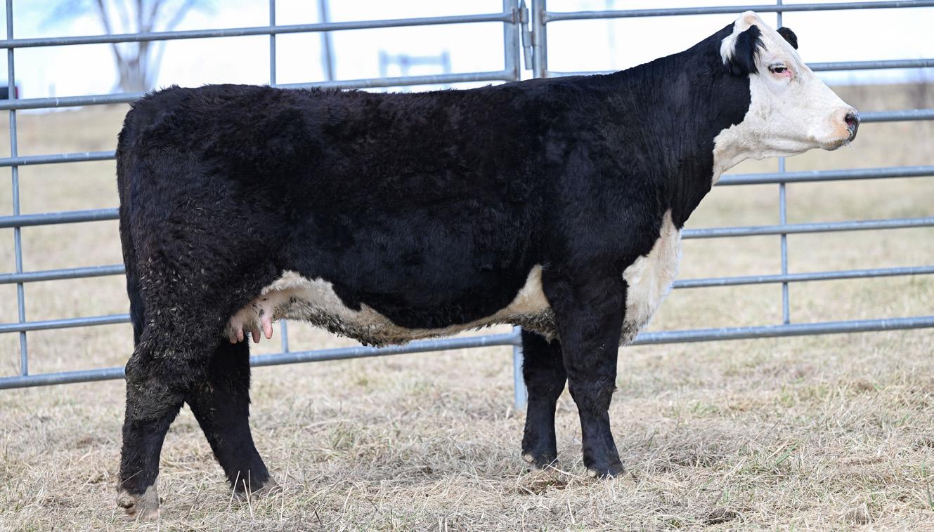 Check out pedigree behind this young cow. A high percentage Black Hereford that is bred to our herd bull that we are really excited about, SIMS FAST KASH 901 K78 ET ET. The service sire a total outcross in the breed, sired by the outstanding Hereford bull Fresh Prince and combined with the championship Black Hereford genetics of his dam, BLZ HALLE 6014 C31 901. This is one of the first two offerings from FAST KASH. Pasture exposed 12/5/24-1/23/25 for a fall 2025 calf.