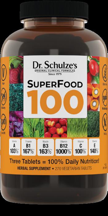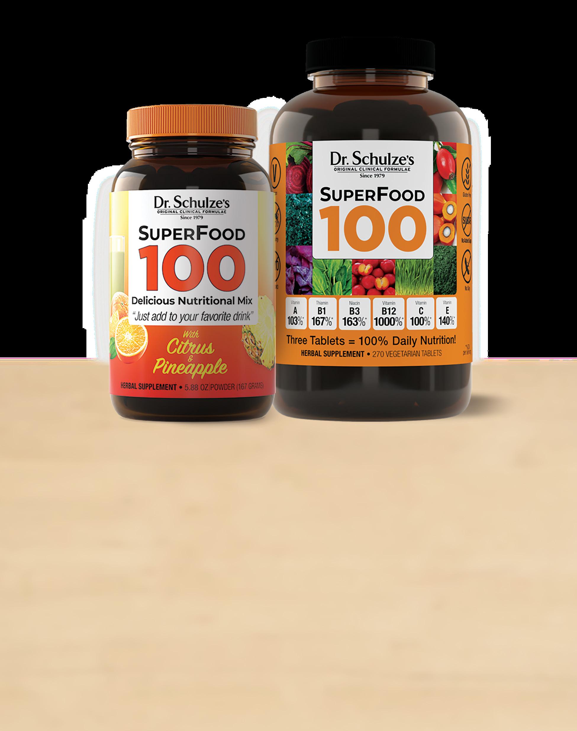 Whether you’re building hormones, immune cells, brain chemicals, or nerve cells, getting your daily vitamins and minerals is crucial for maintaining healthy organs, staying energetic, and looking and feeling your best. That’s why Dr. Schulze created SuperFood 100.