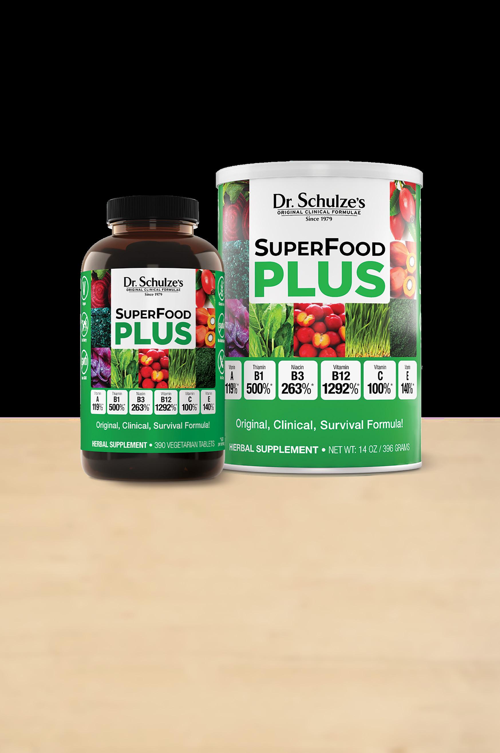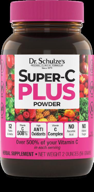 SuperFood ULTRA combines three of Dr. Schulze’s most popular formulas in one jar: nutrient-rich SuperFood PLUS, Vitamin C-packed Super-C PLUS, and fiberfilled HerbalMucil PLUS.