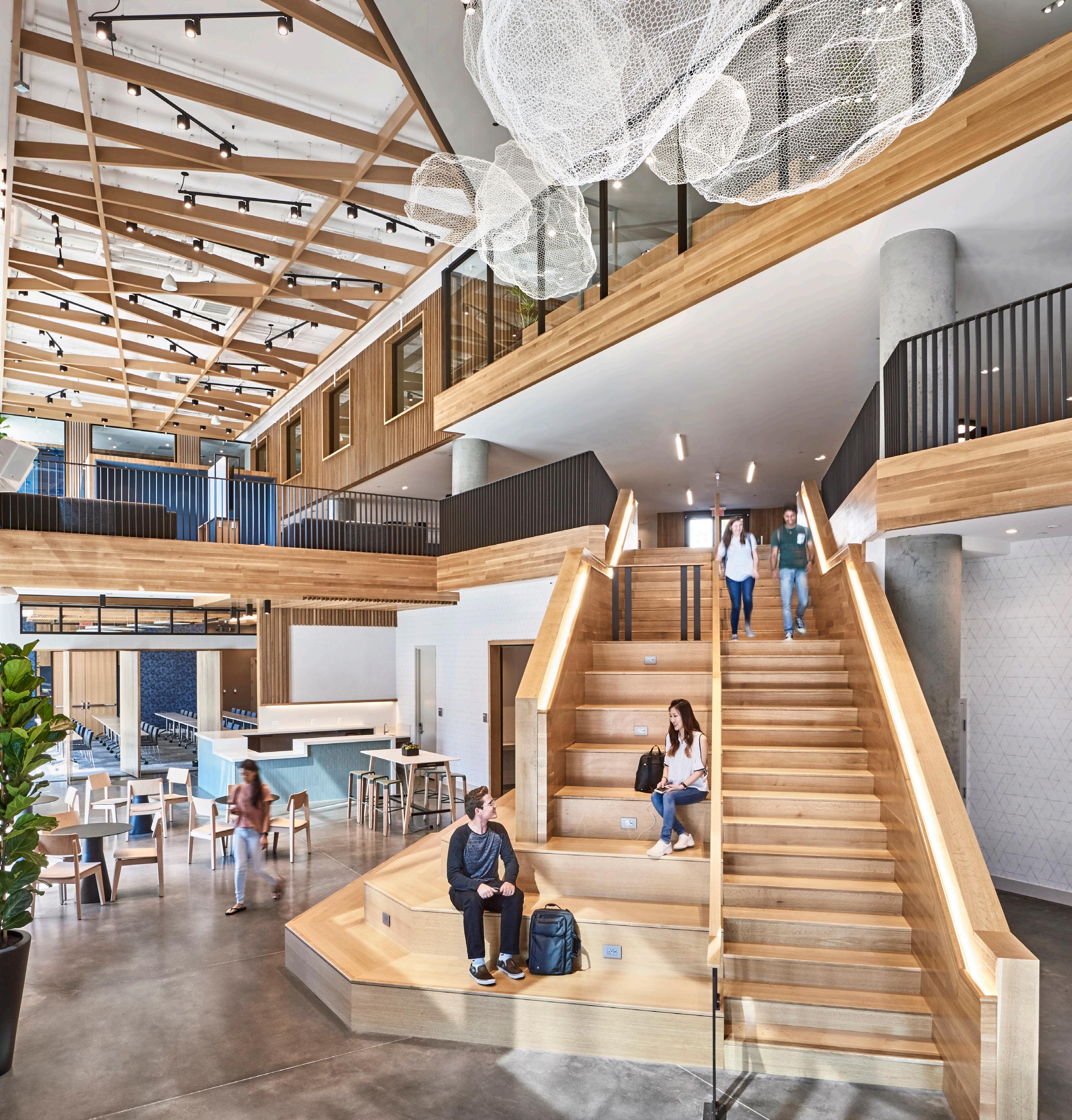 The eight-story community was designed with 780 beds for first-year students organized in a series of pods with double-occupancy rooms and community-style bathrooms. Amenities include an academic success center, fitness center and lounge, along with 7,000 sq. ft. of street-level retail. The project also includes 5,200 sq. ft. of flexible office and meeting space for a local non-profit that has focused on youth and student support programs for more than a century. The building consumes 44 percent less energy than required by the stringent local code and performs 70 percent better than similar buildings in the same climate — earning the project LEED Gold certification.